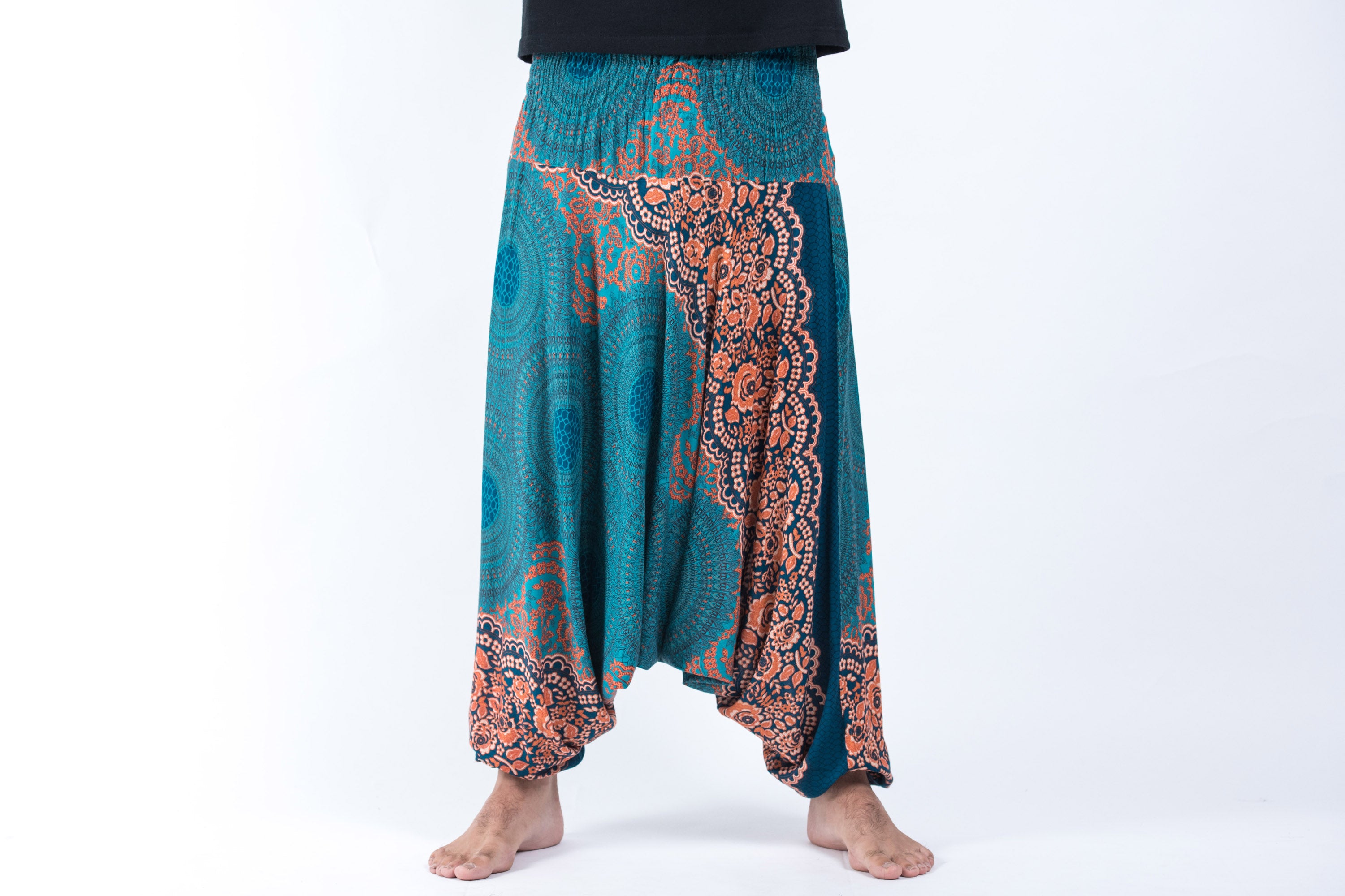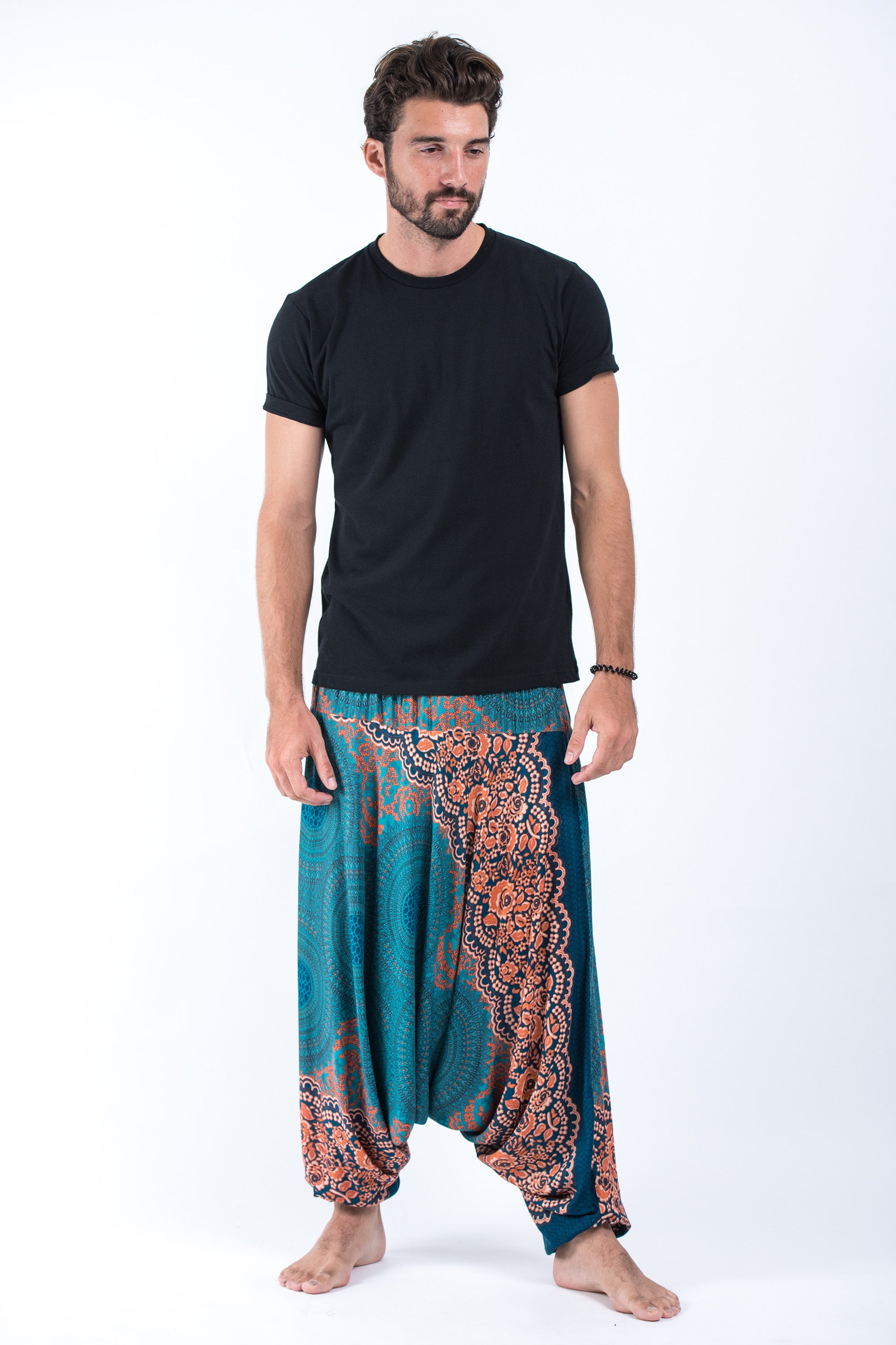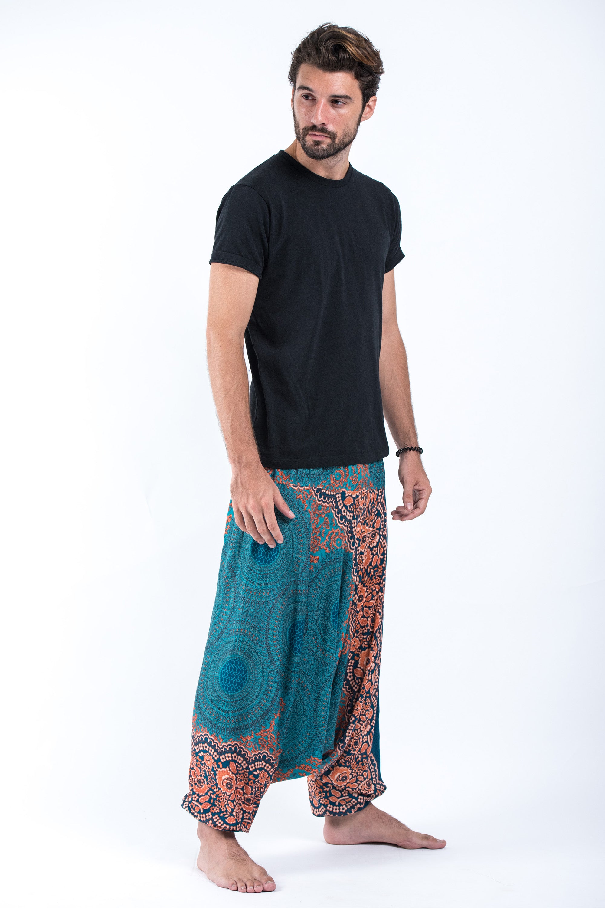 Geometric Mandalas Drop Crotch Men's Harem Pants in Turquoise