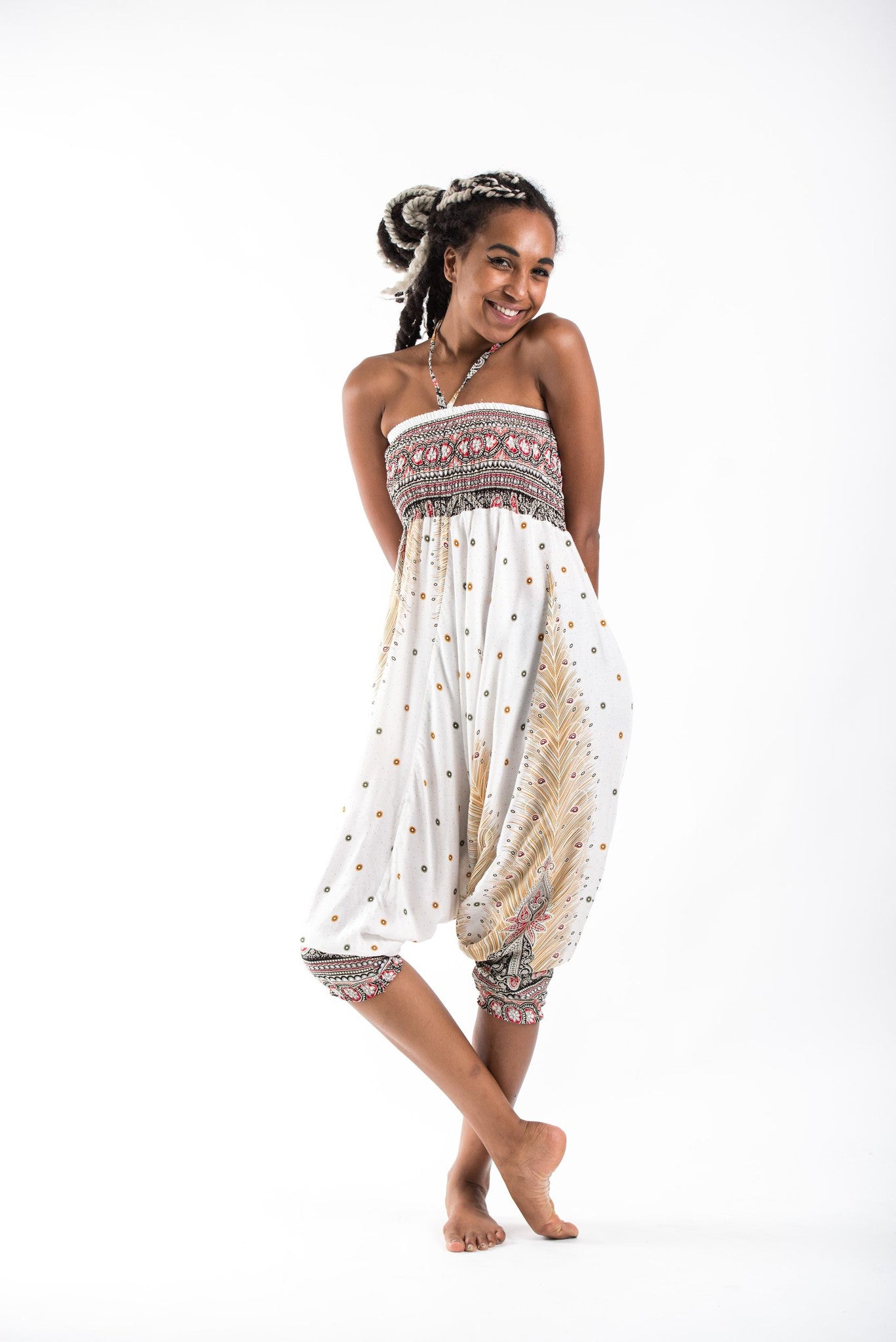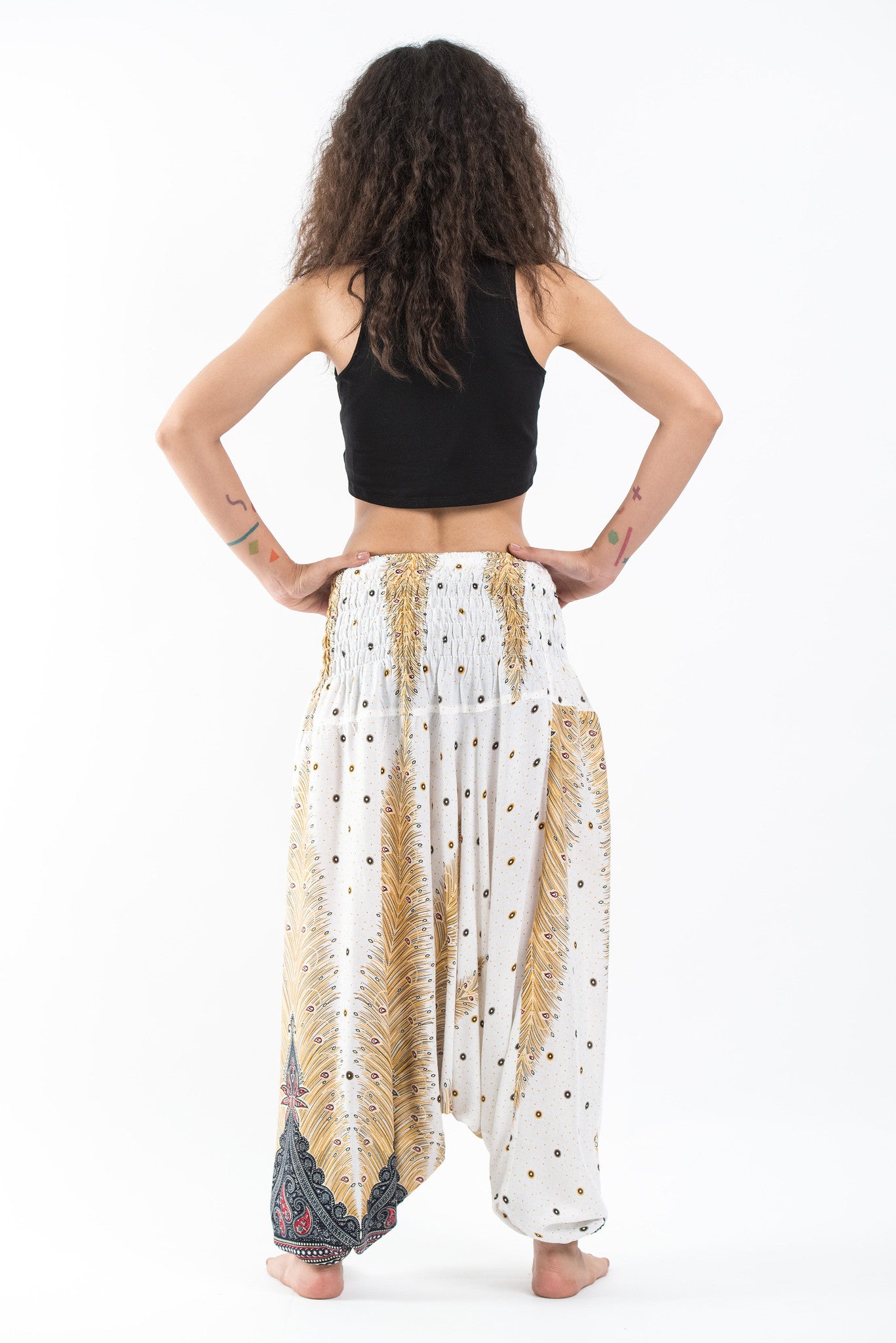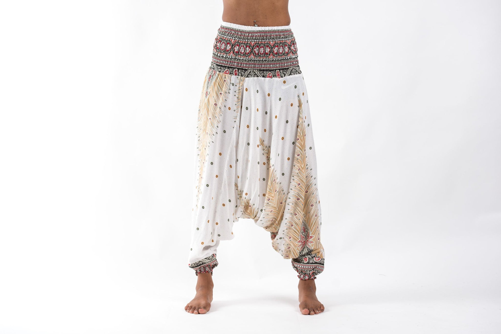 Peacock Feathers 2-in-1 Jumpsuit Harem Pants in White