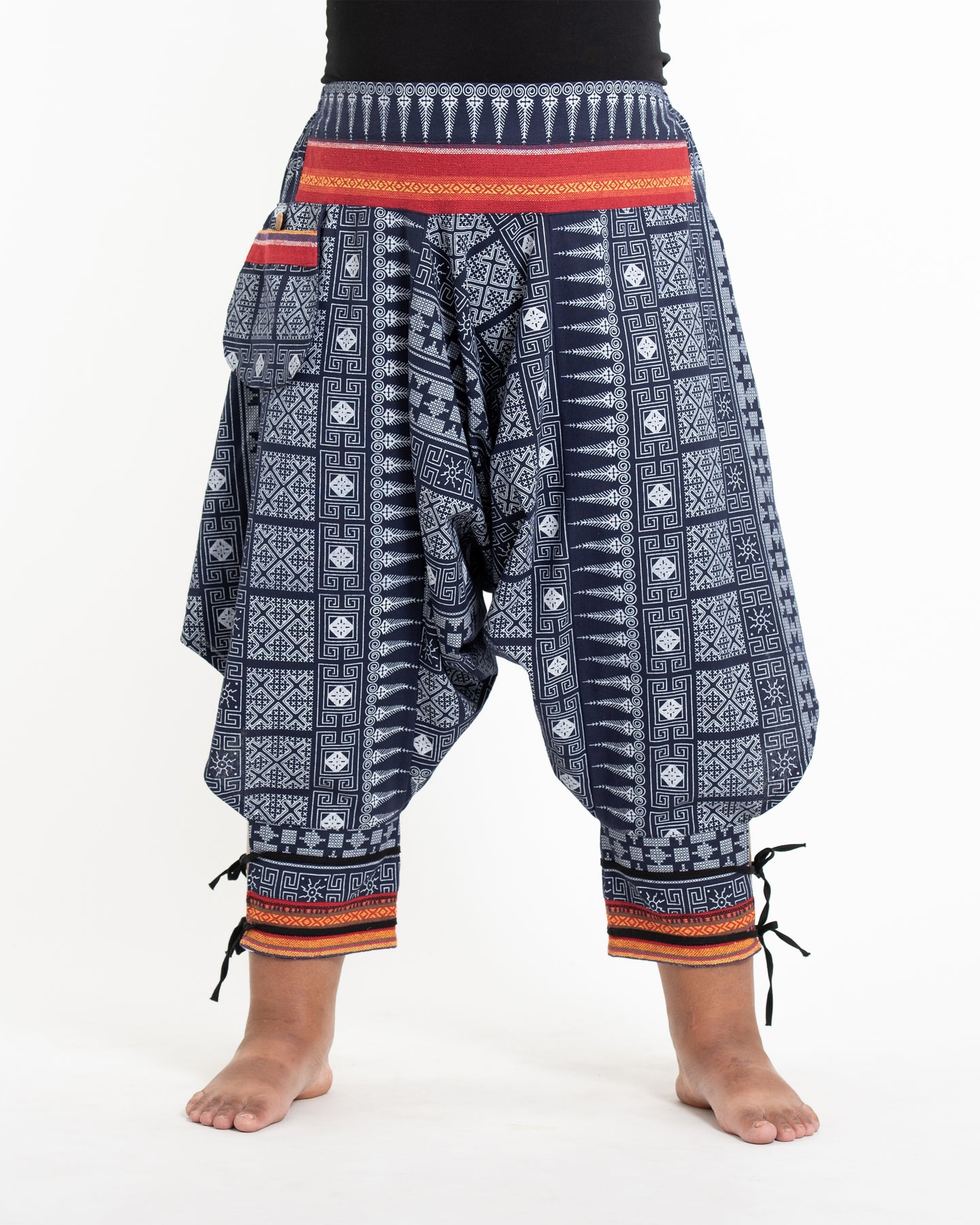 Plus Size Traditional Prints Thai Hill Tribe Fabric Women's Harem Pants with Ankle Straps in Navy
