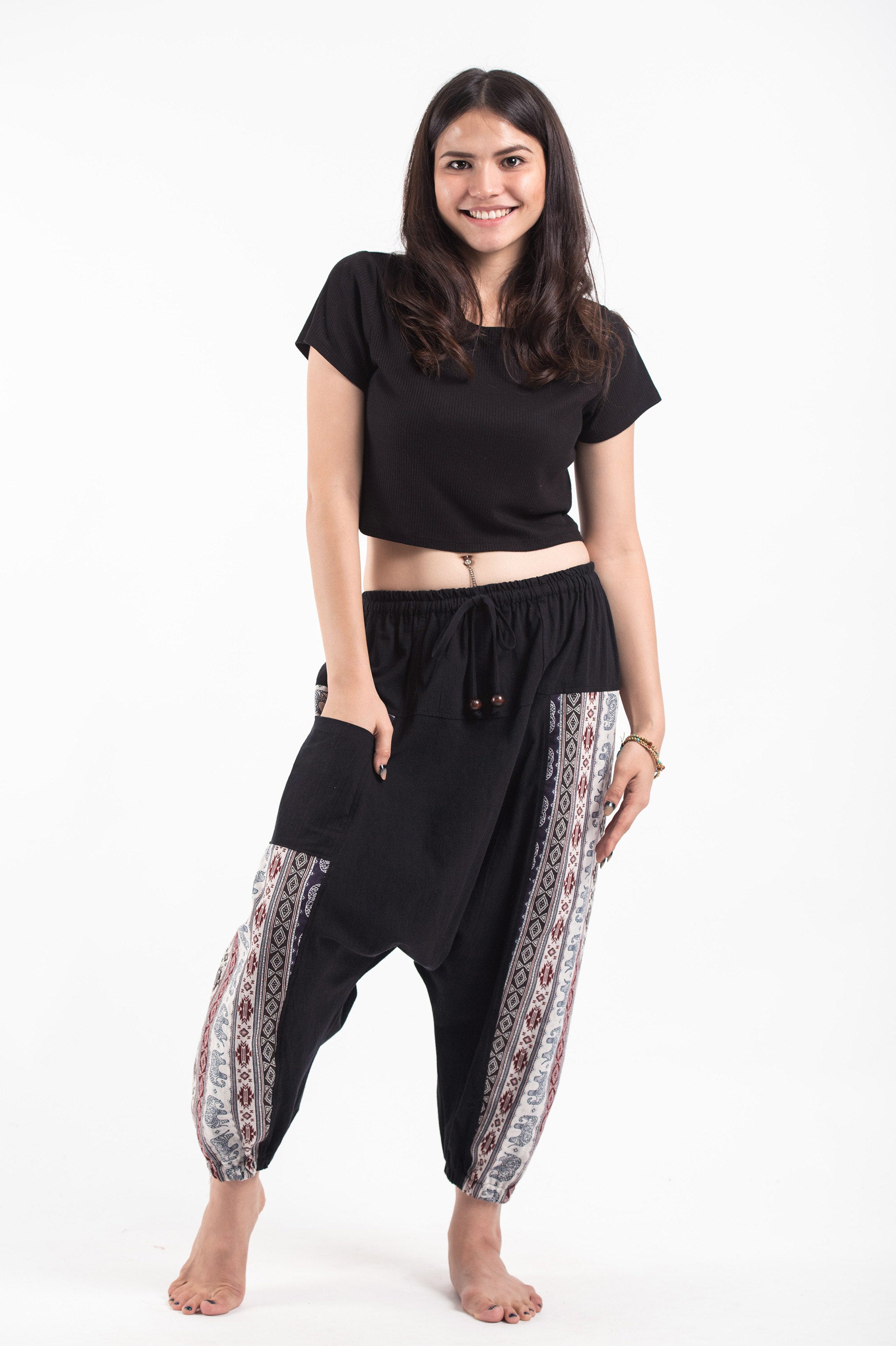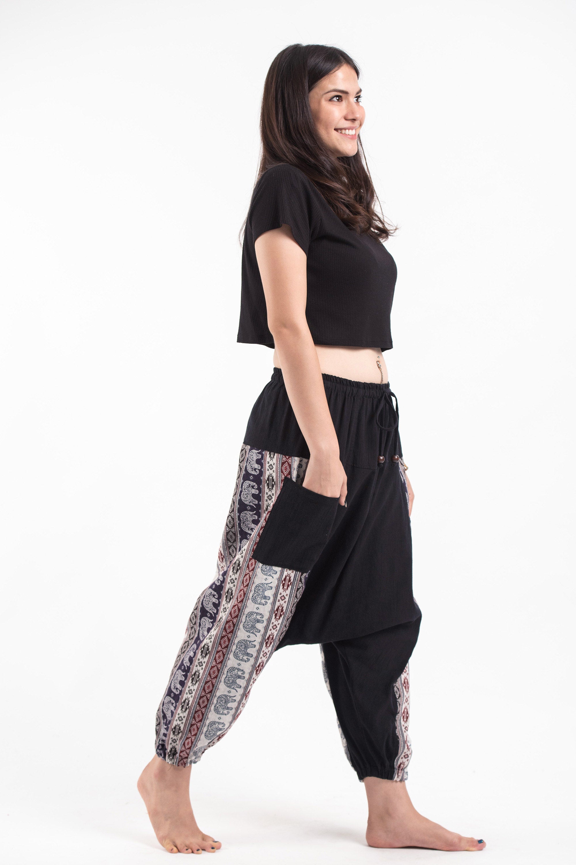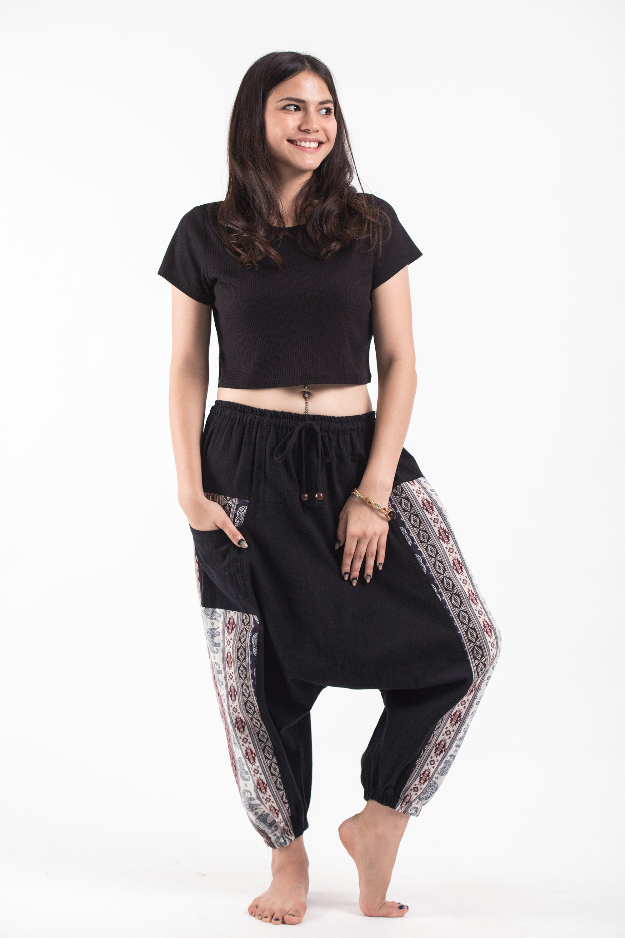 The fabric composing these pants is a thicker cotton, and does not have stretch at all. This is not a problem, however, because the way the pants are built does not restrict range of movement. I am 5'5" and I can wear these low on my hips, the ends hitting my ankles, or up on my waist, resulting in a longer capri style. Sometimes the pants ride up from my hips to sit at my waist, such as when I drive. Doesn't bother me much. The pocket(s?) are large (can hold my kindle) and the drawstring keeps the waistband up even when the pockets are full. Great pants. I have black and red, love them both!