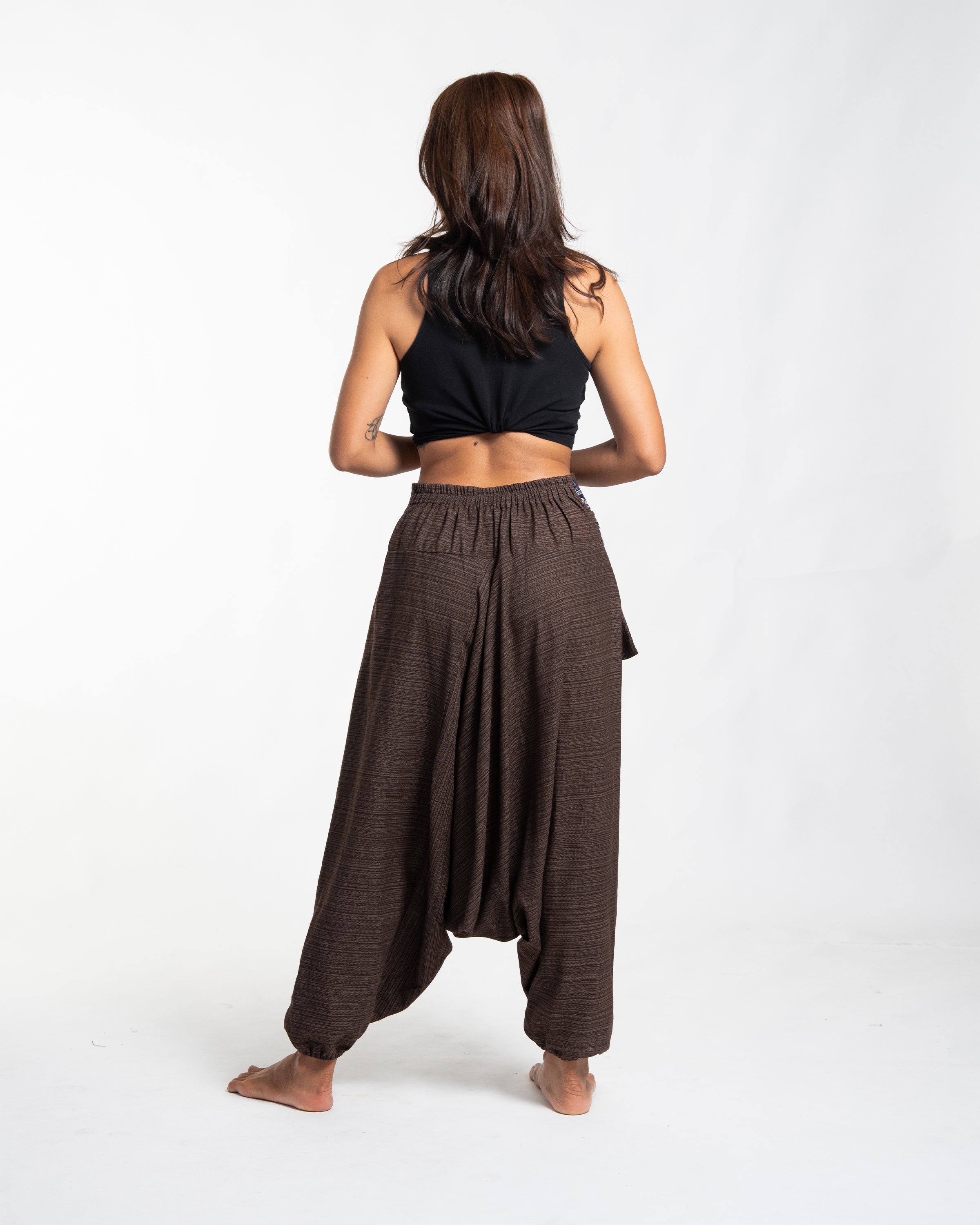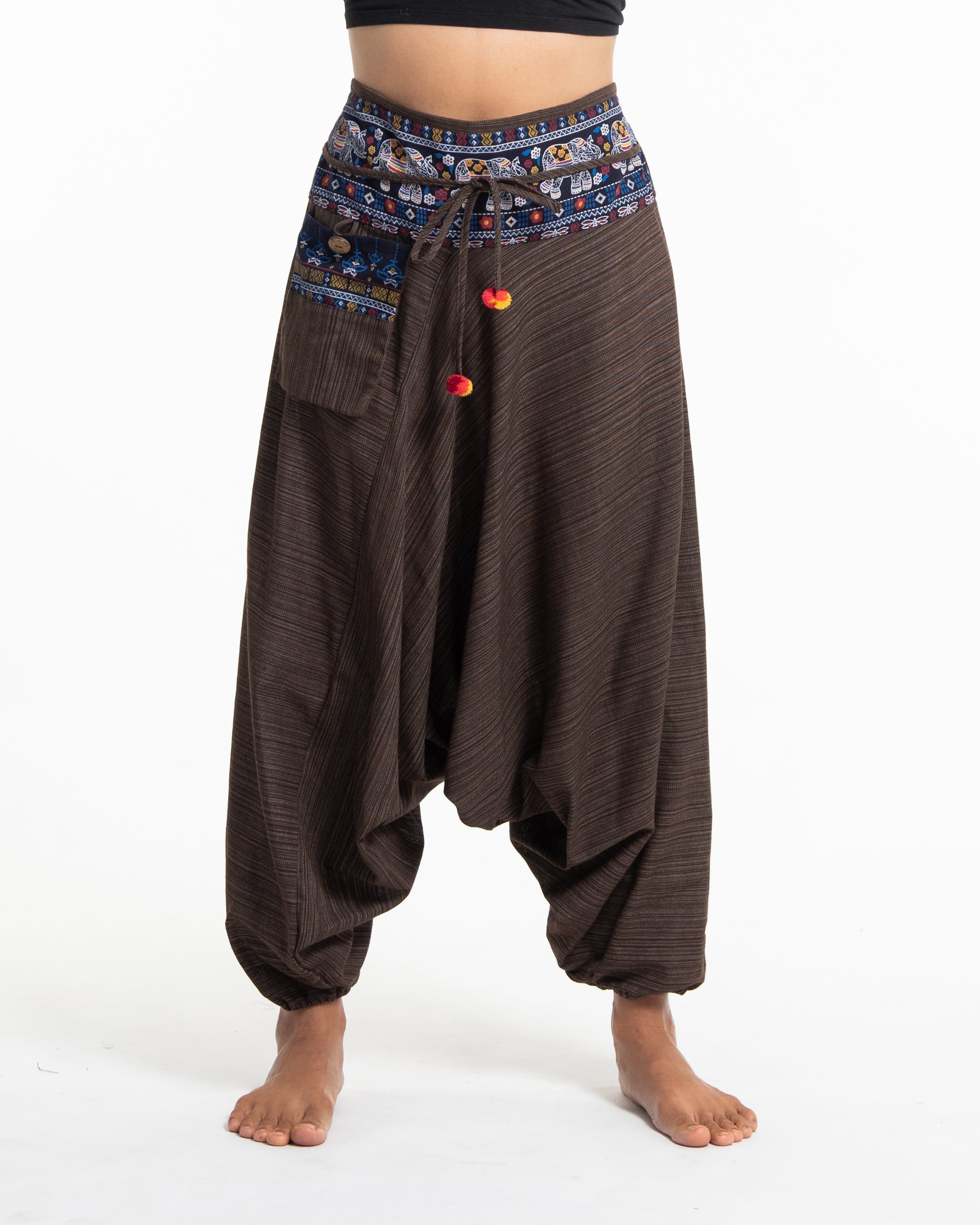 Pinstripe Cotton Low Cut Women's Harem Pants with Elephant Trim in Brown