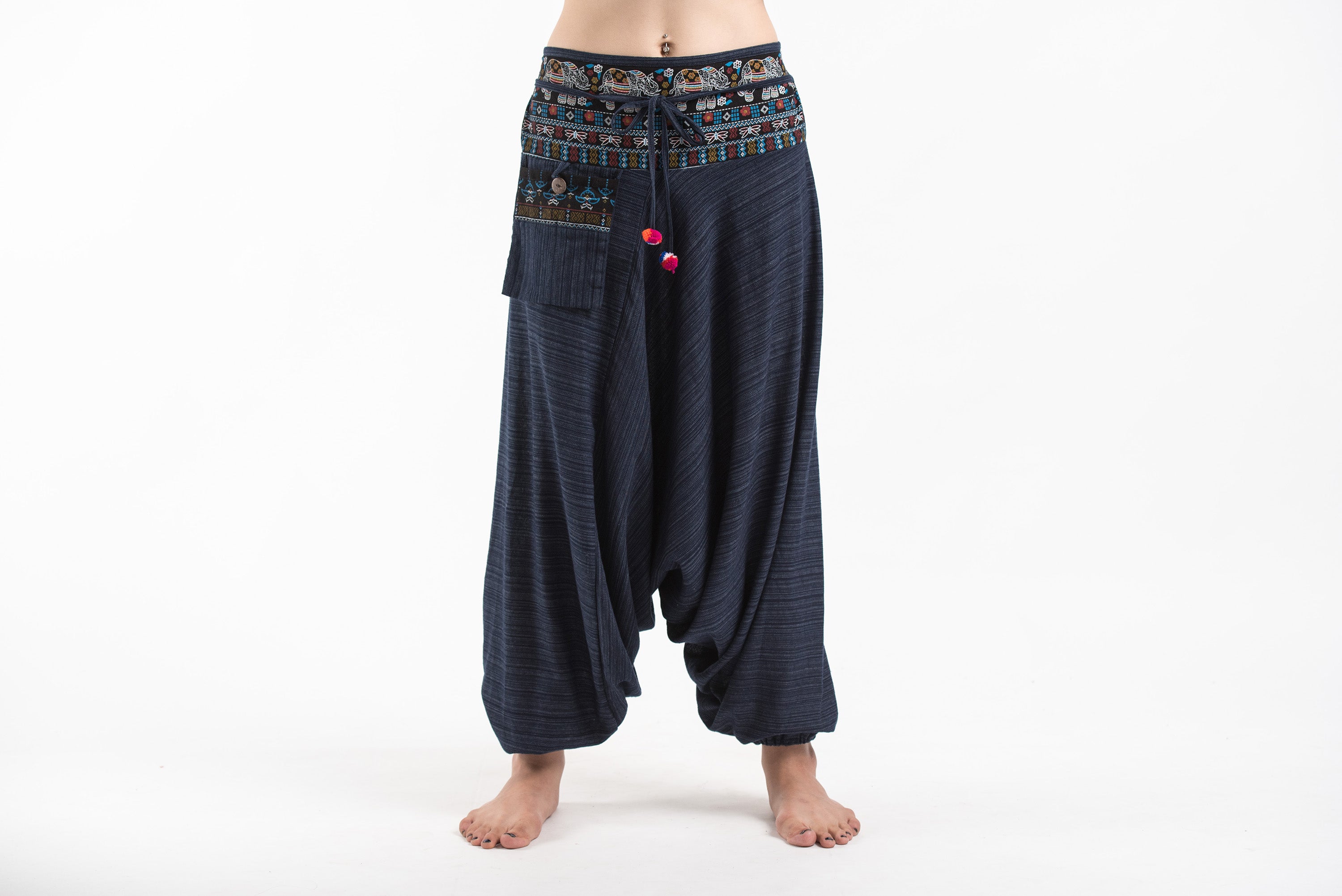 Pinstripe Cotton Low Cut Women's Harem Pants with Elephant Trim in Navy