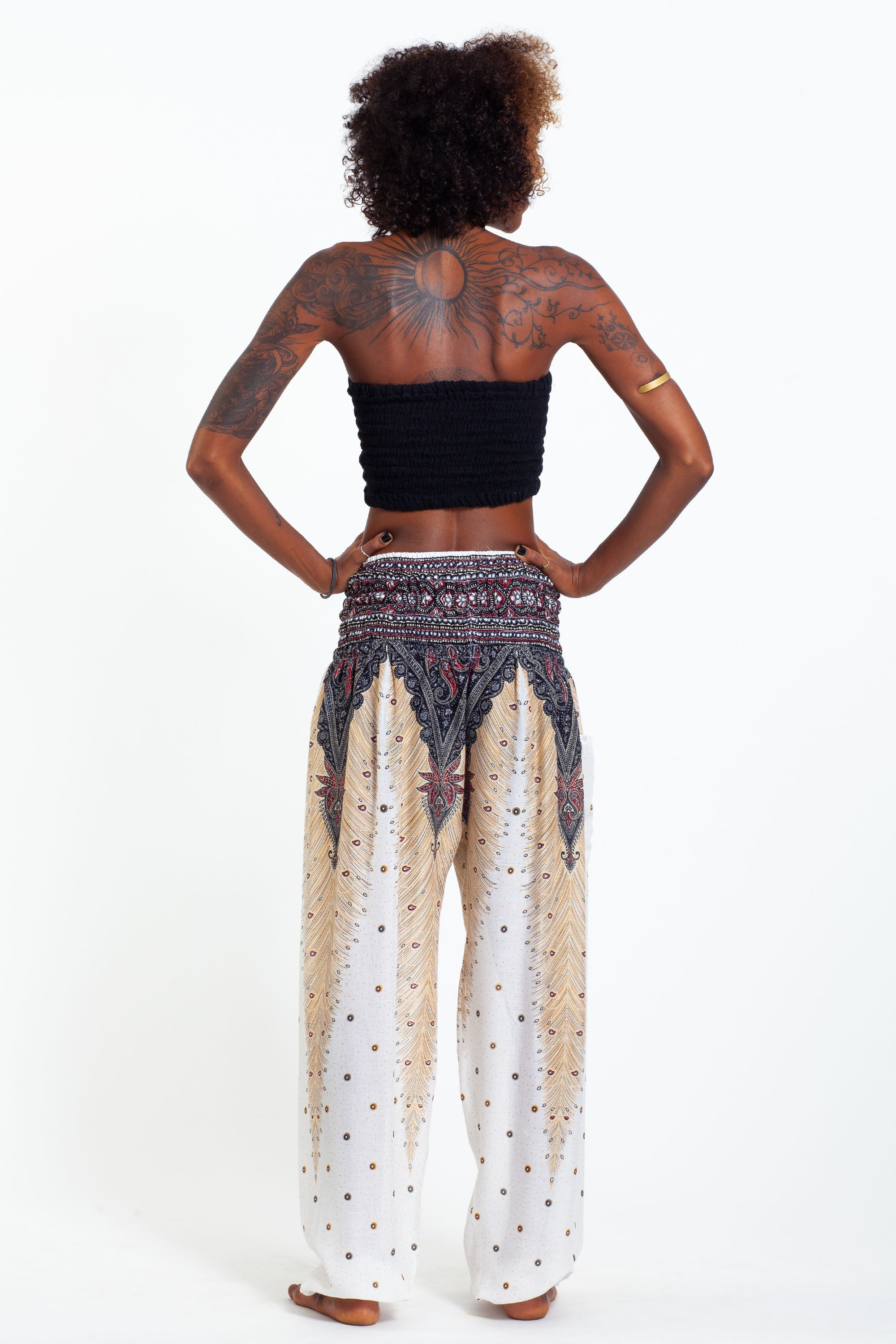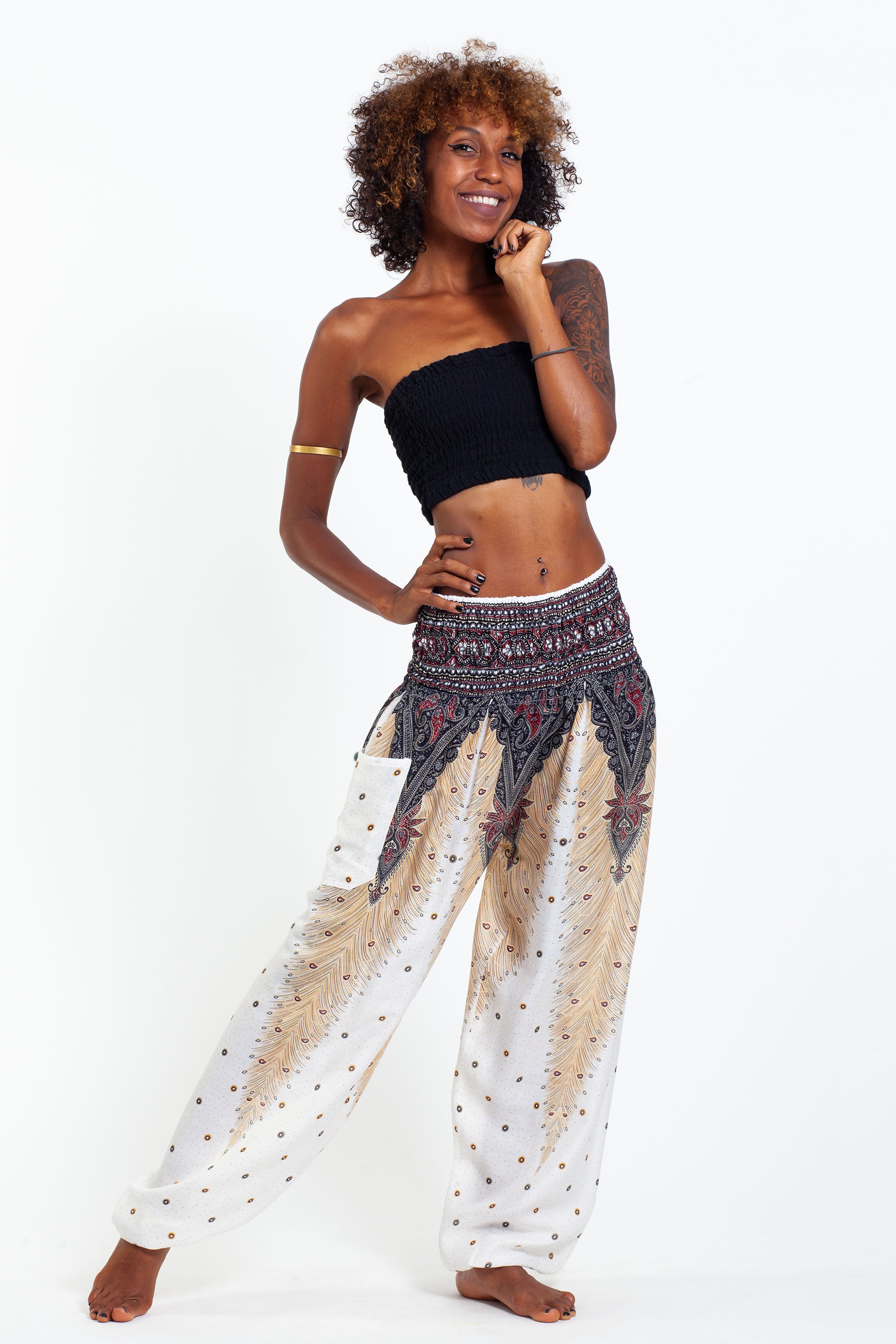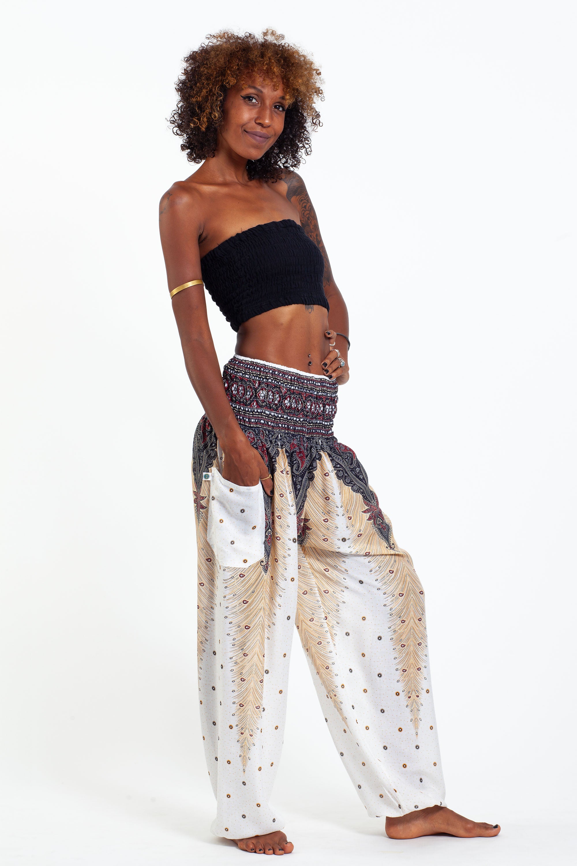 I agree with various comments about these pants - you literally don’t have to put any thought into what color underwear you wear with these white pants, because the placement of the darker pattern at the top covers any possible show through, which cannot be said for all white pants, LOL! The pattern is absolutely beautiful and enchanting. These pants are extremely comfortable and extremely versatile! The waistband can be worn high-waisted, or you can fold it down in half to wear them low-waisted at your hips. You can also push the elastic ankle cuff above your calf muscle and let the fabric drape over the cuff to turn the pants into capris. They go with any kind of footwear- boots, sandals, slip-ons, or even barefoot. They can be dressed up with a nice top and jewelry, or worn casually with a tank top or a hoodie. You can even wear them to sleep as pyjamas, which I have done many times!!! You can bend and move so freely in them, so you can wear them for any sort of activity. The fabric is very soft, light, and flowy. I’m definitely looking forward to wearing these during the warm weather and at the beach! I’m astounded how these pants are “one size” and just automatically fit perfectly! If you’re thinking about getting these, definitely get them - you won’t be disappointed!!!