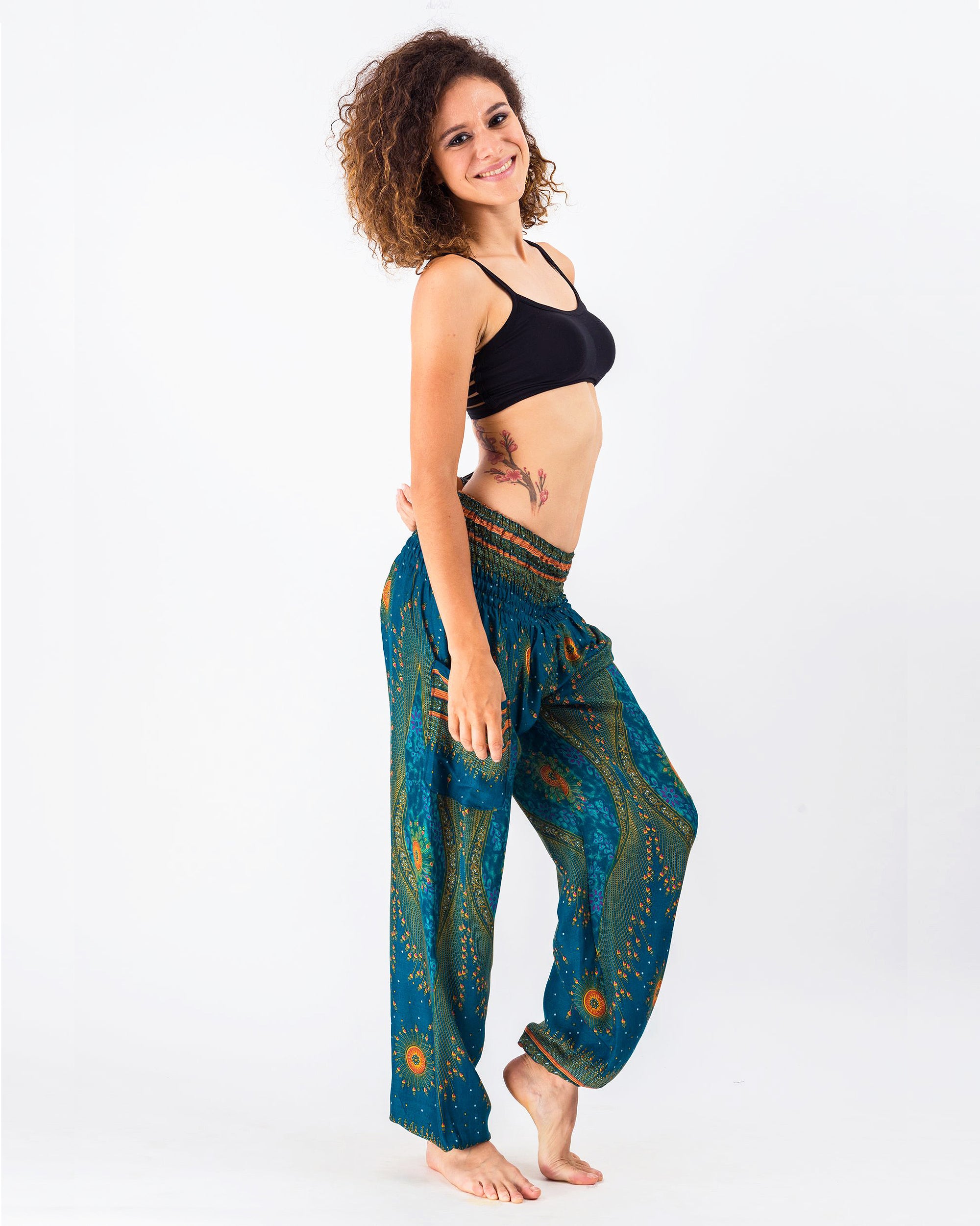 I enjoy wearing these peacock eye women's harem pants in turquoise.