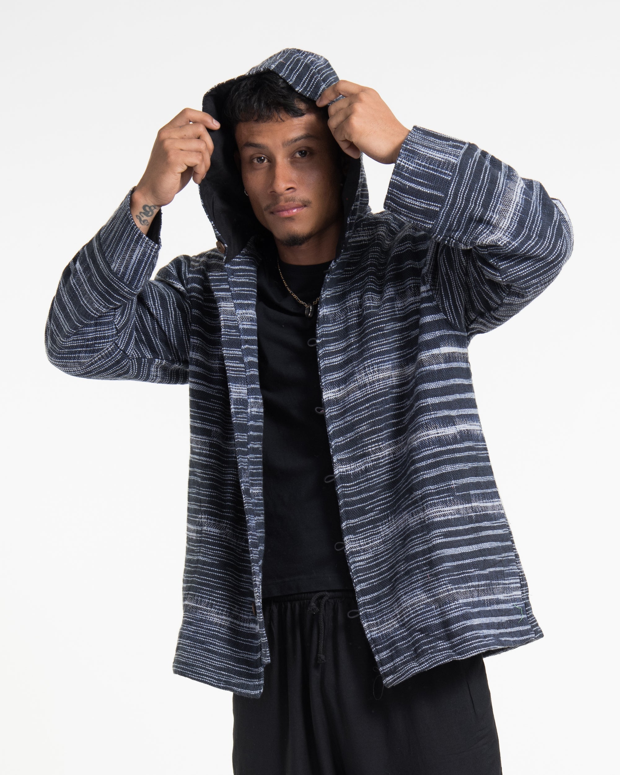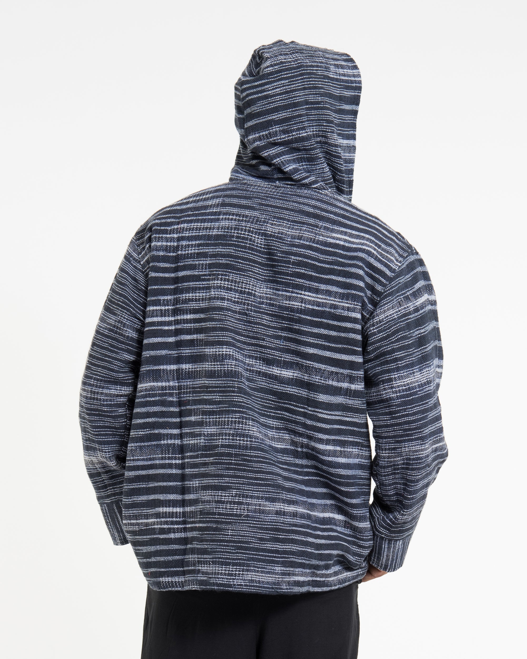 Light Hooded Button Hand-Woven Cotton Jacket in Navy