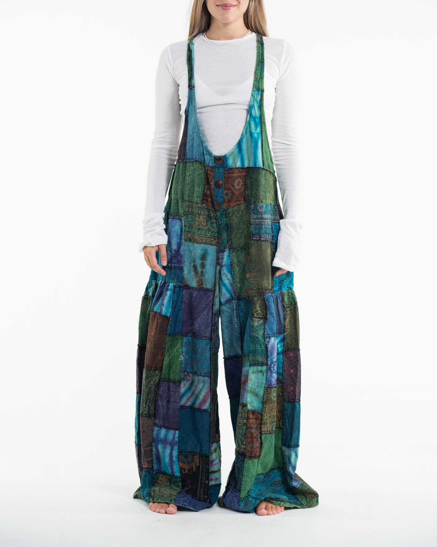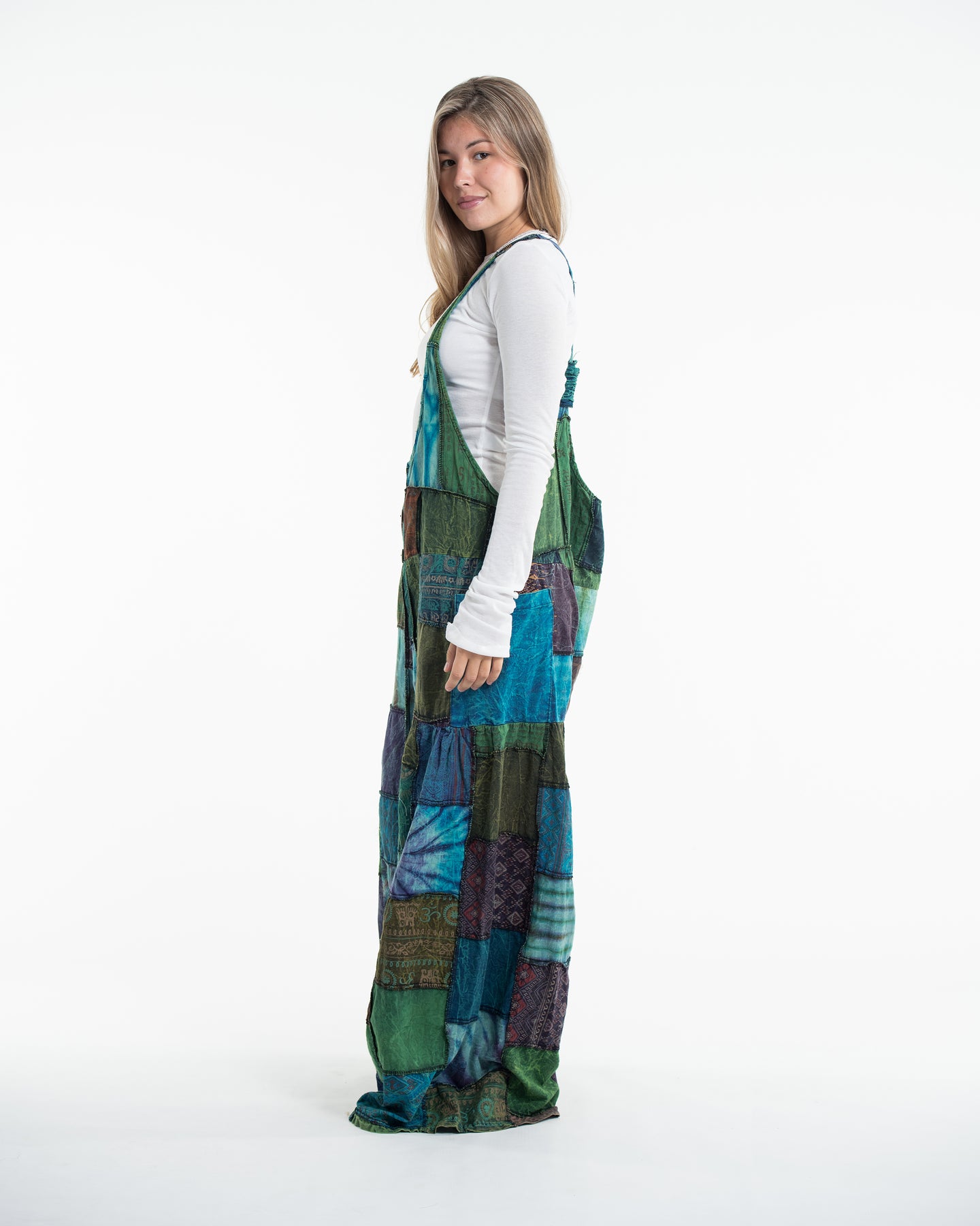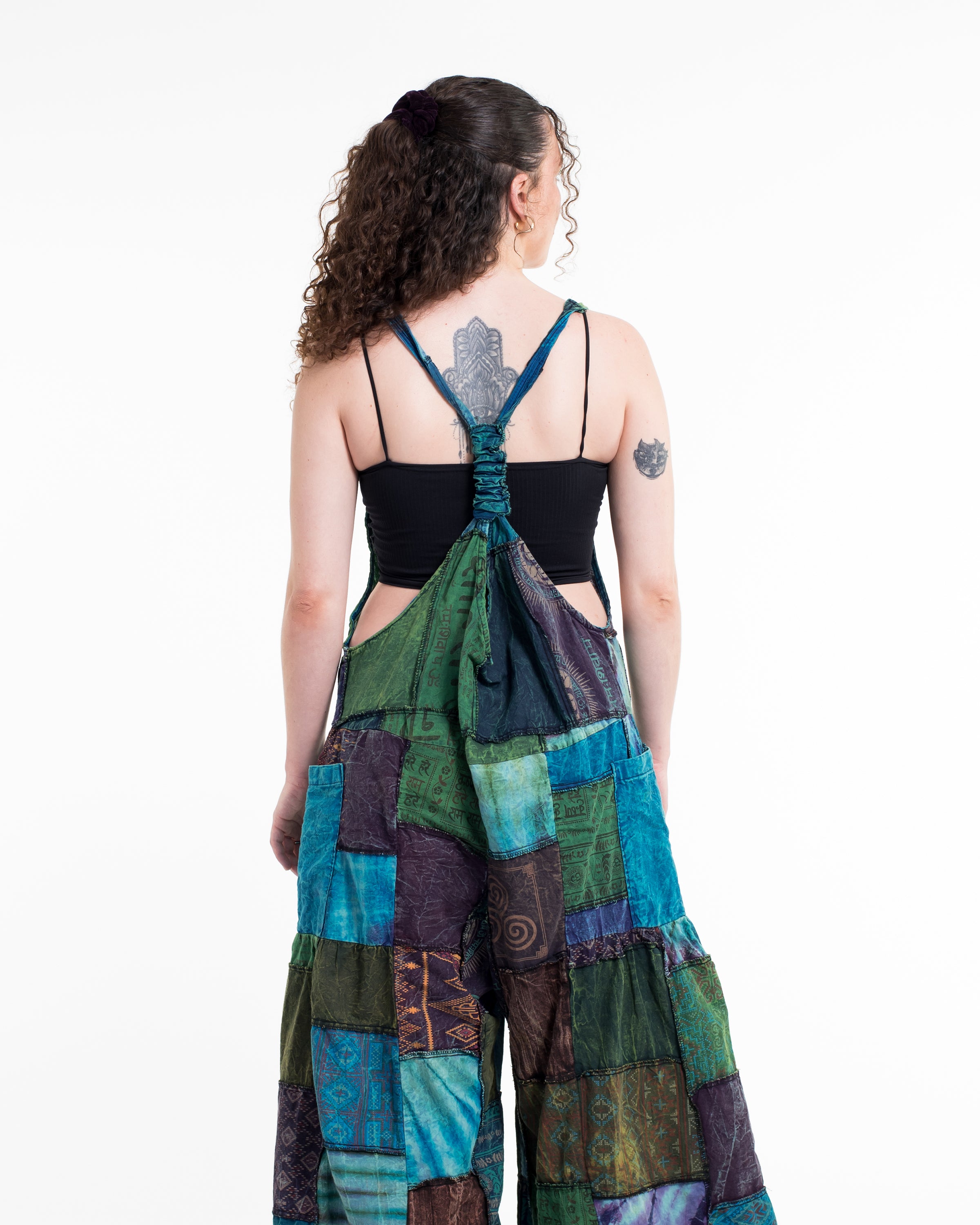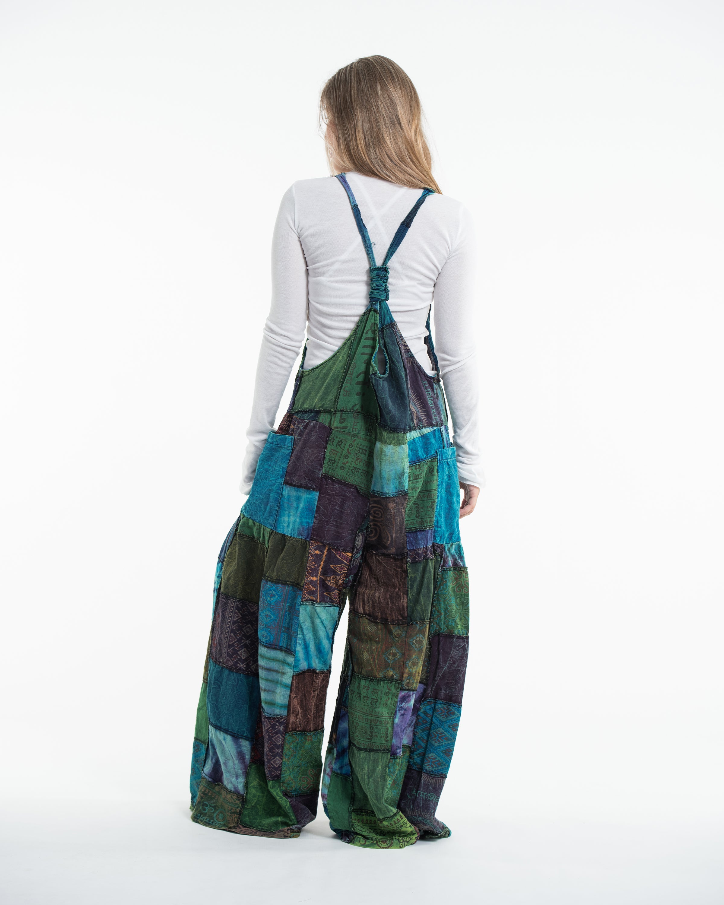 Perfectly handcrafted Indian patchwork stone-washed cotton overall with adjustable length and a button at the back. There are three holes to adjust the straps with a coconut button closure. One pocket in the front and two pockets on the side. Maximum comfort with roomy legs and an elastic back.
