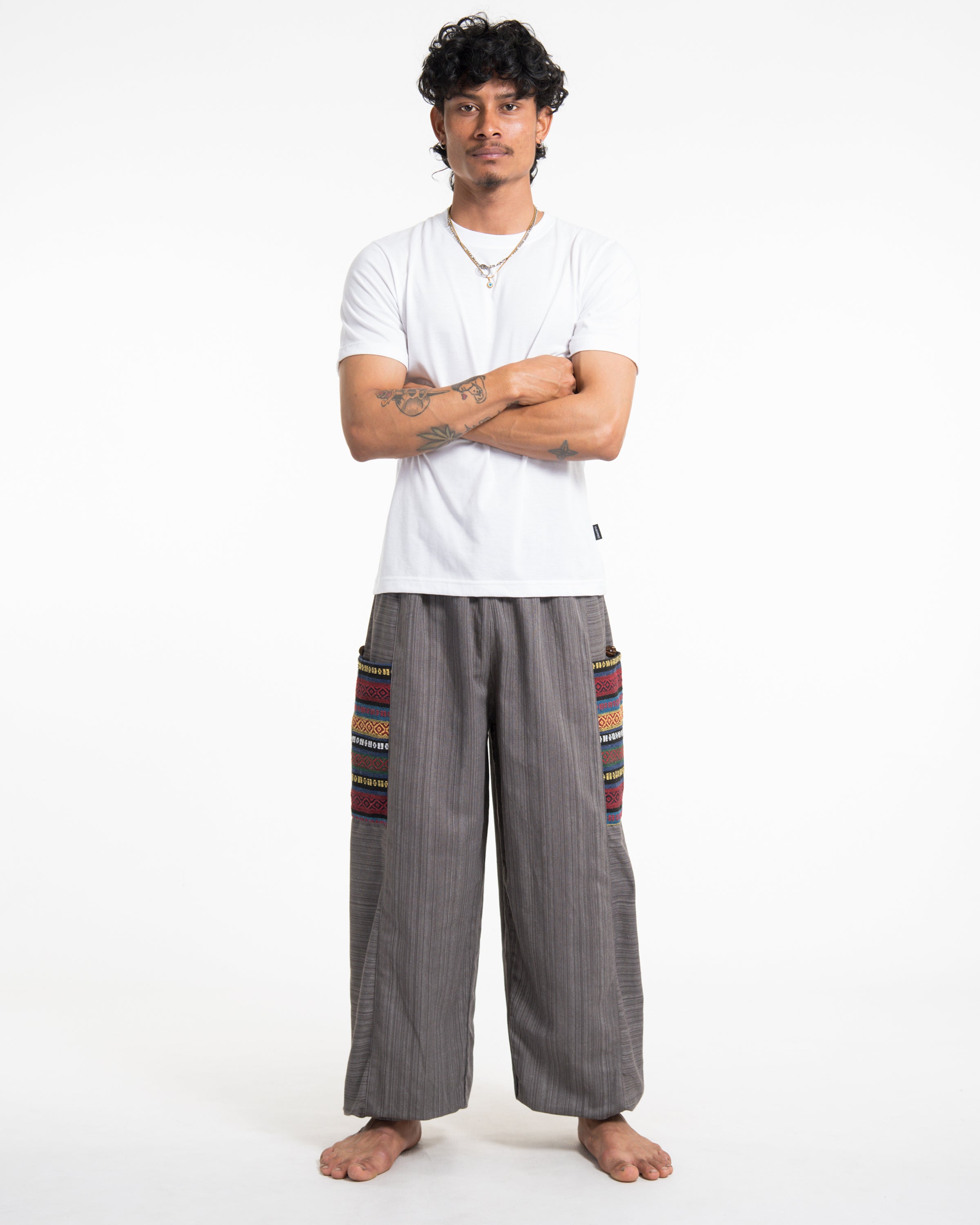 Men's Drawstring Pinstripes Cotton Pants with Aztec Pocket in Gray