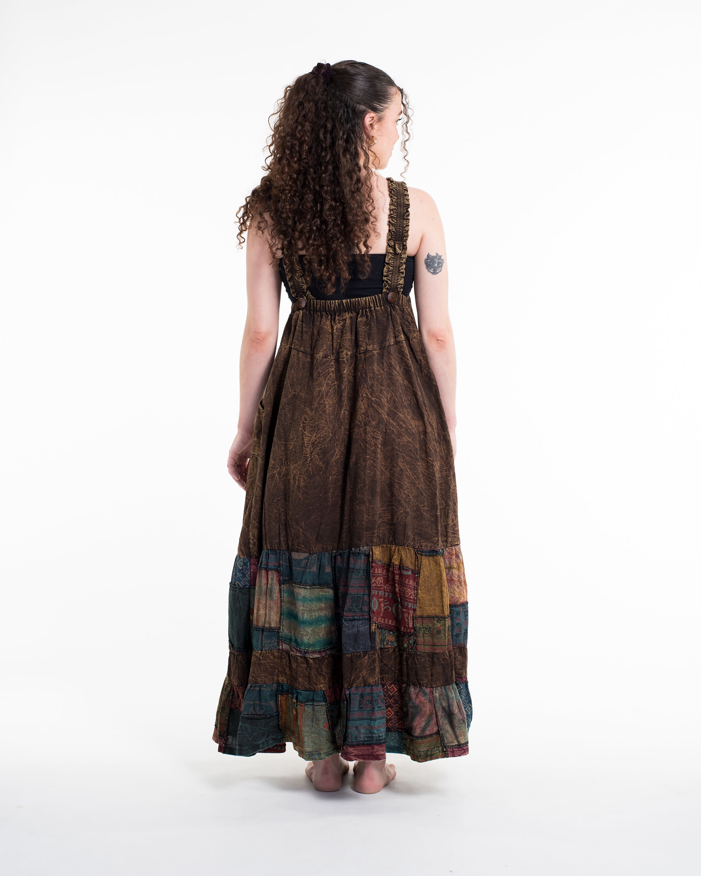 Perfectly handcrafted Indian patchwork stone washed cotton overall dress with adjustable length with a button at the back. There is 3 holes to adjust the straps with coconut buttons closure straps. Two pockets on the side. Maximum roomy comfort and with elastic at the back.