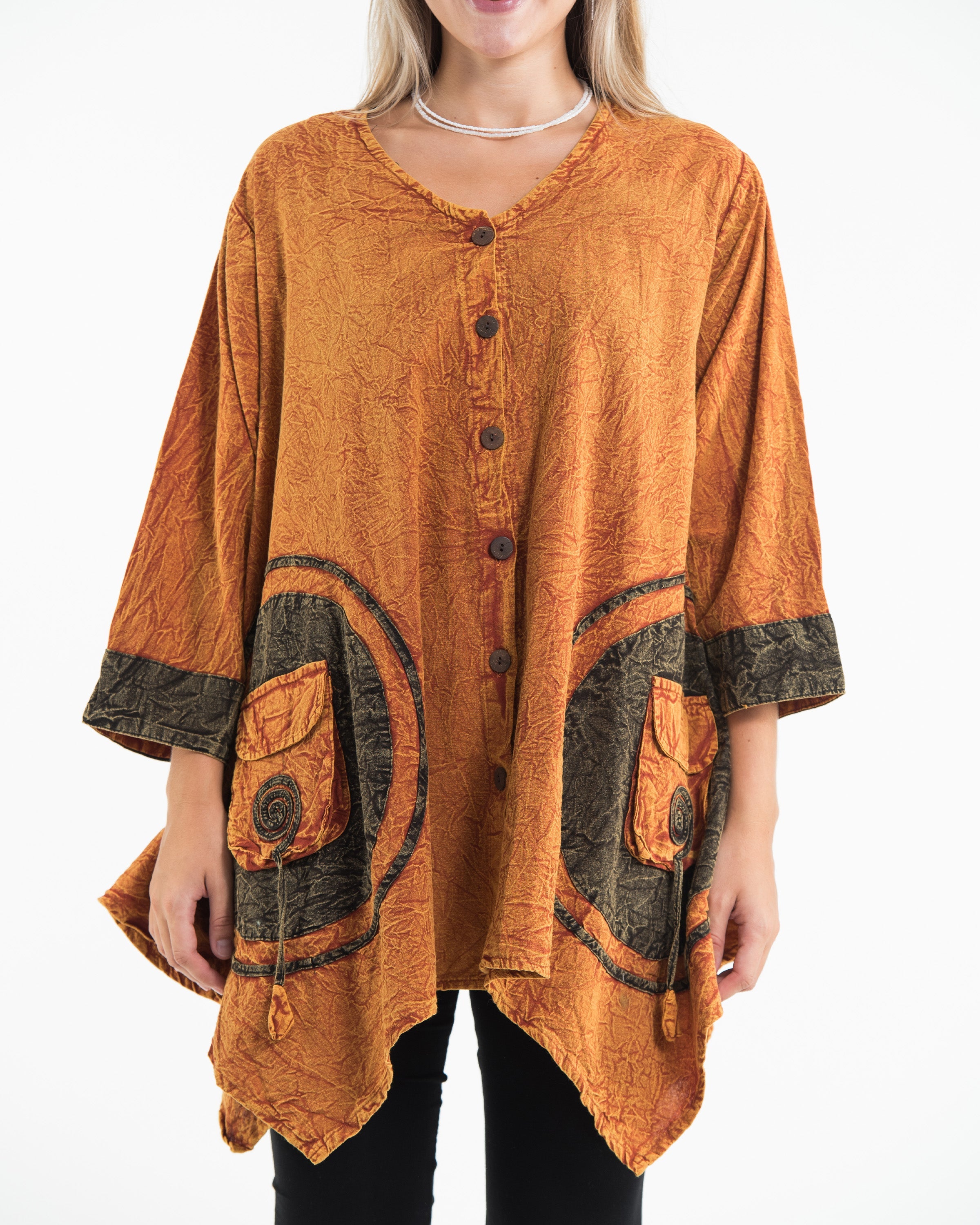 Made from tribal fabric and stonewashed cotton panels, this piece features a flattering, draped cut and a button-up front. Decorated with a handcrafted spiral detail on the pocket. Wear it as a tunic or unbutton it to use as a lightweight outer layer, like a cardigan.