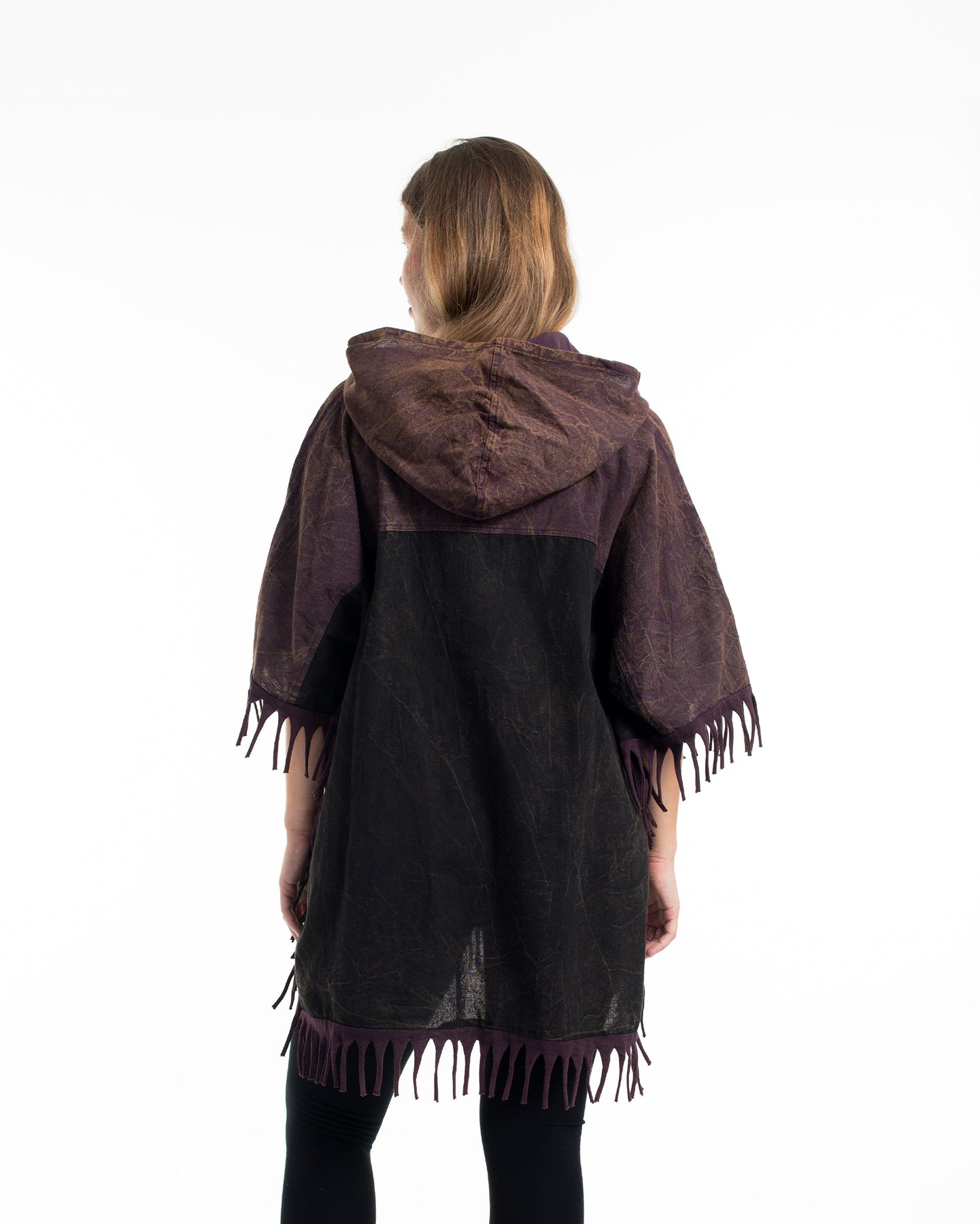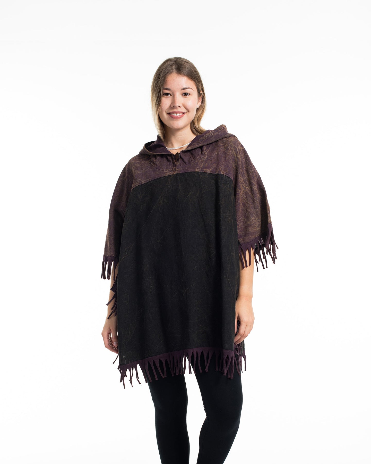 Stay cozy and stylish with this lightweight, stonewashed poncho. Featuring a relaxed fit, hood, and wooden button closure, its two-tone design and fringe trim add the perfect boho touch. One size fits most.