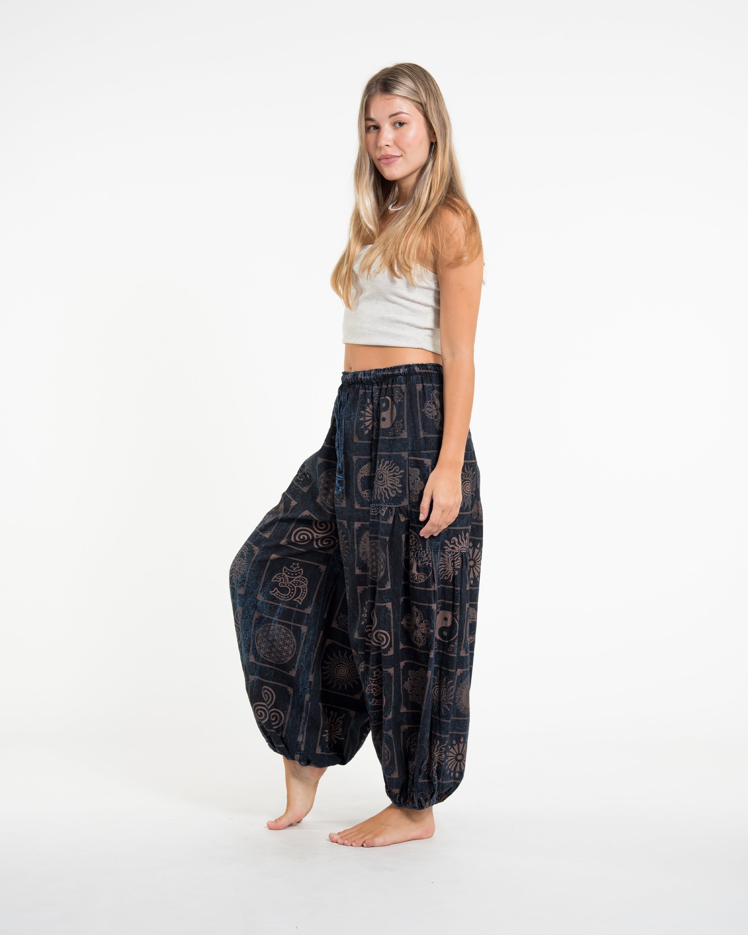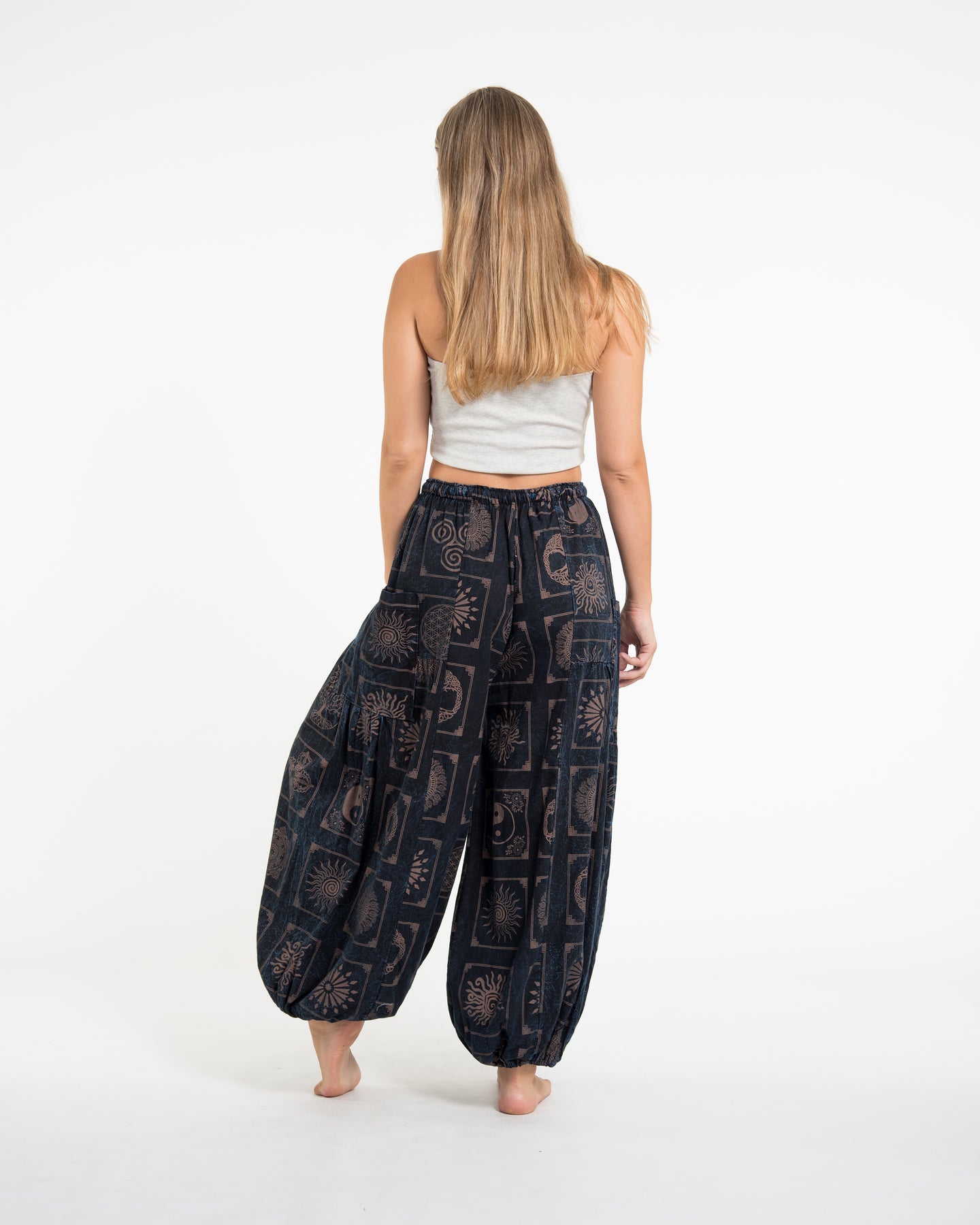 Women's Block Print Stone Washed Balloon Cotton Pants in Black Blue