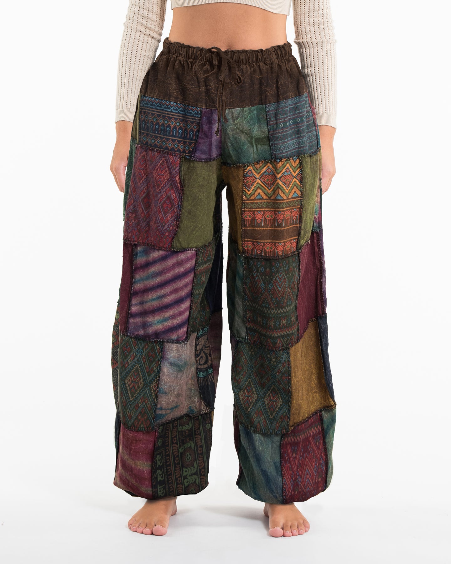 Step into ultimate comfort and creativity with these genie-style patchwork pants. Each pair is handcrafted from stonewashed cotton patches featuring traditional patterns and colorful tones. With a voluminous silhouette and elasticated ankles, they bring freedom of movement and laid-back vibes to any outfit.