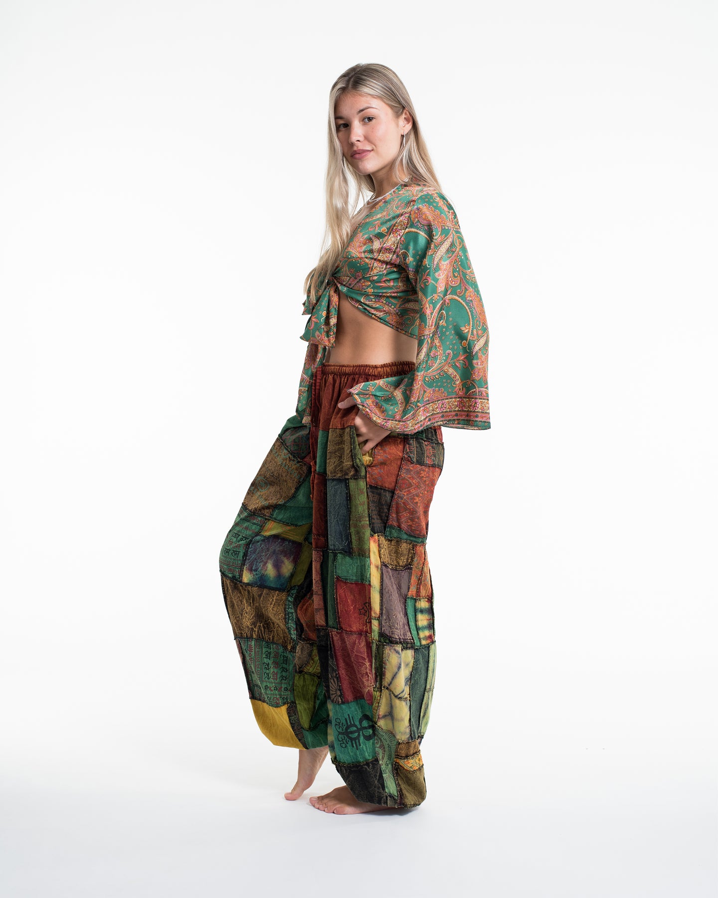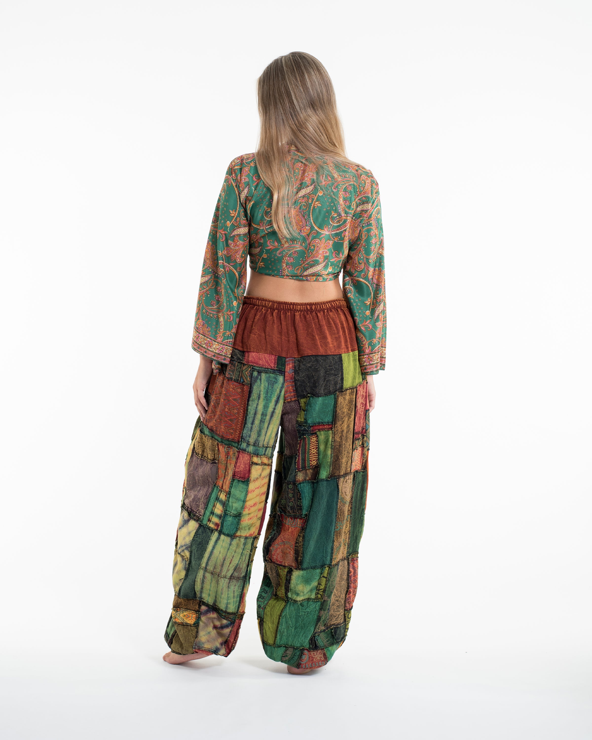 Step into ultimate comfort and creativity with these genie-style patchwork pants. Each pair is handcrafted from stonewashed cotton patches featuring traditional patterns and colorful tones. With a voluminous silhouette and elasticated ankles, they bring freedom of movement and laid-back vibes to any outfit.