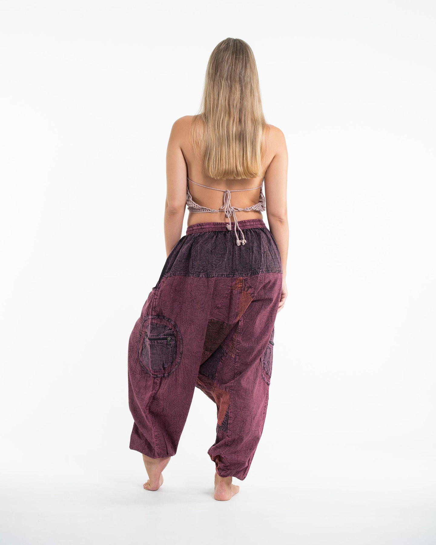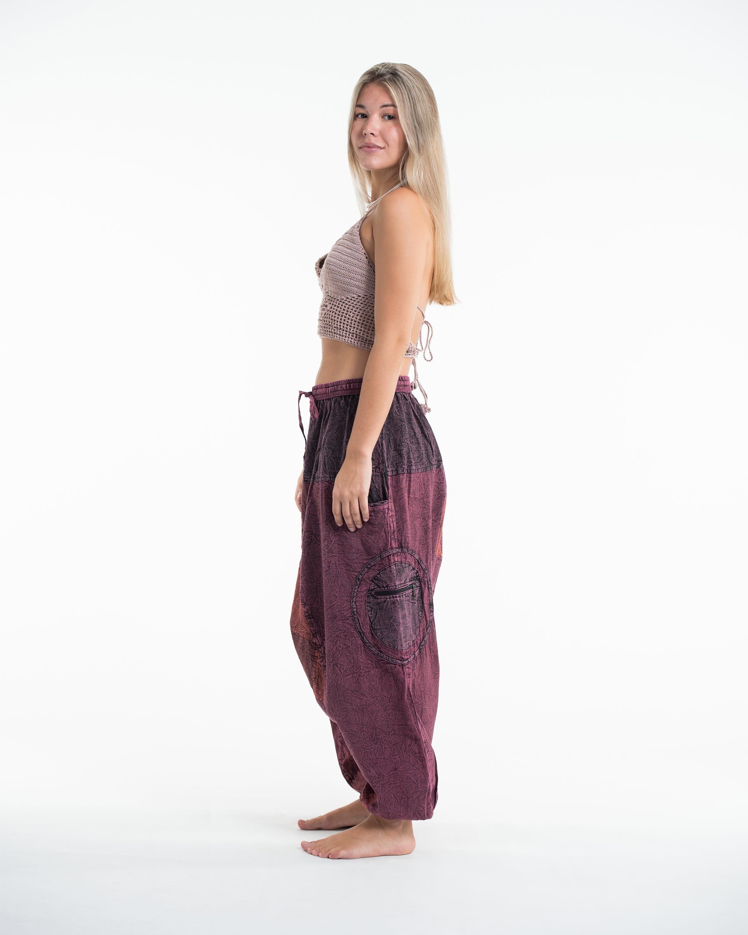 Womens Patchwork Stone Washed Low Cut Cotton Pants in Maroon 03