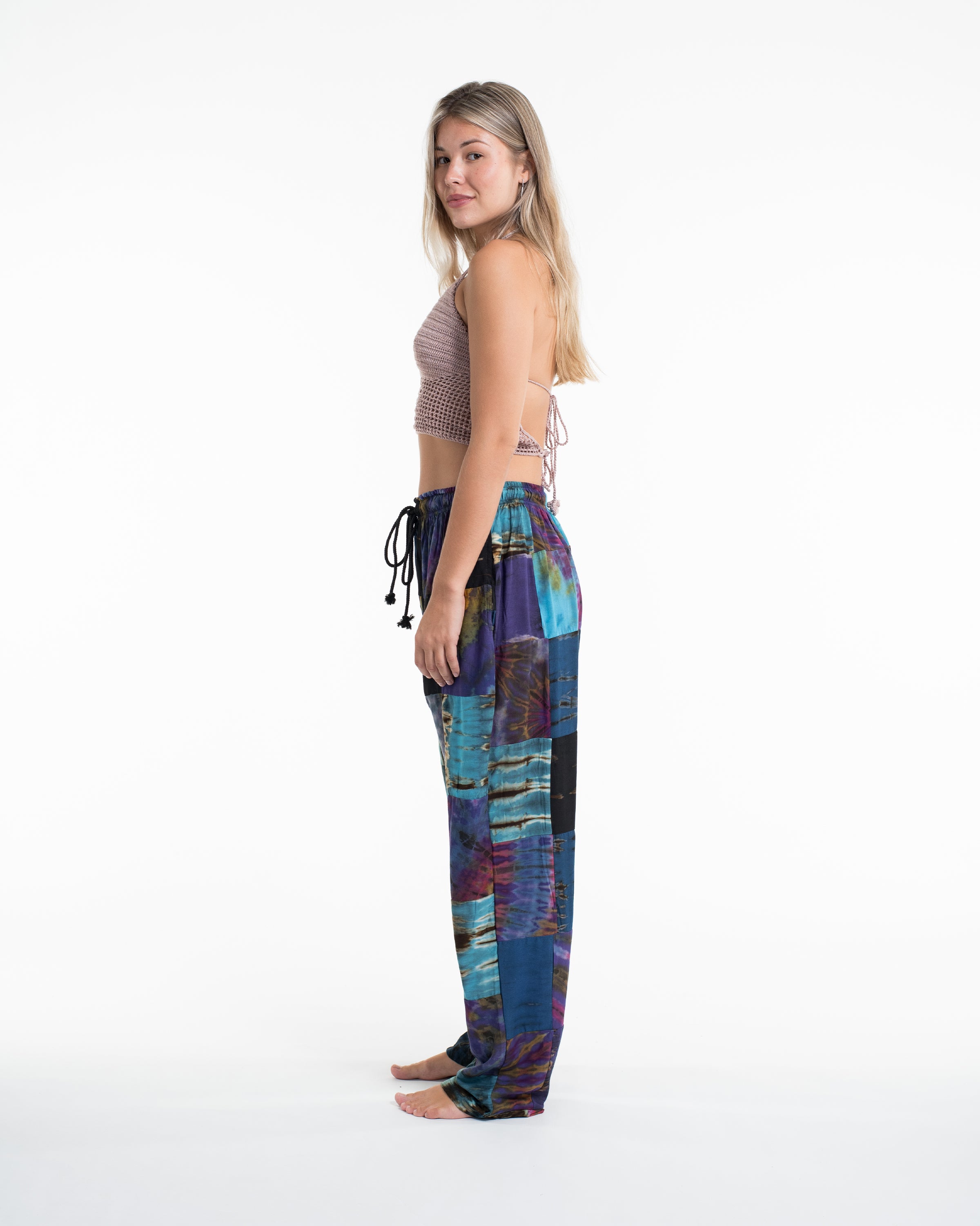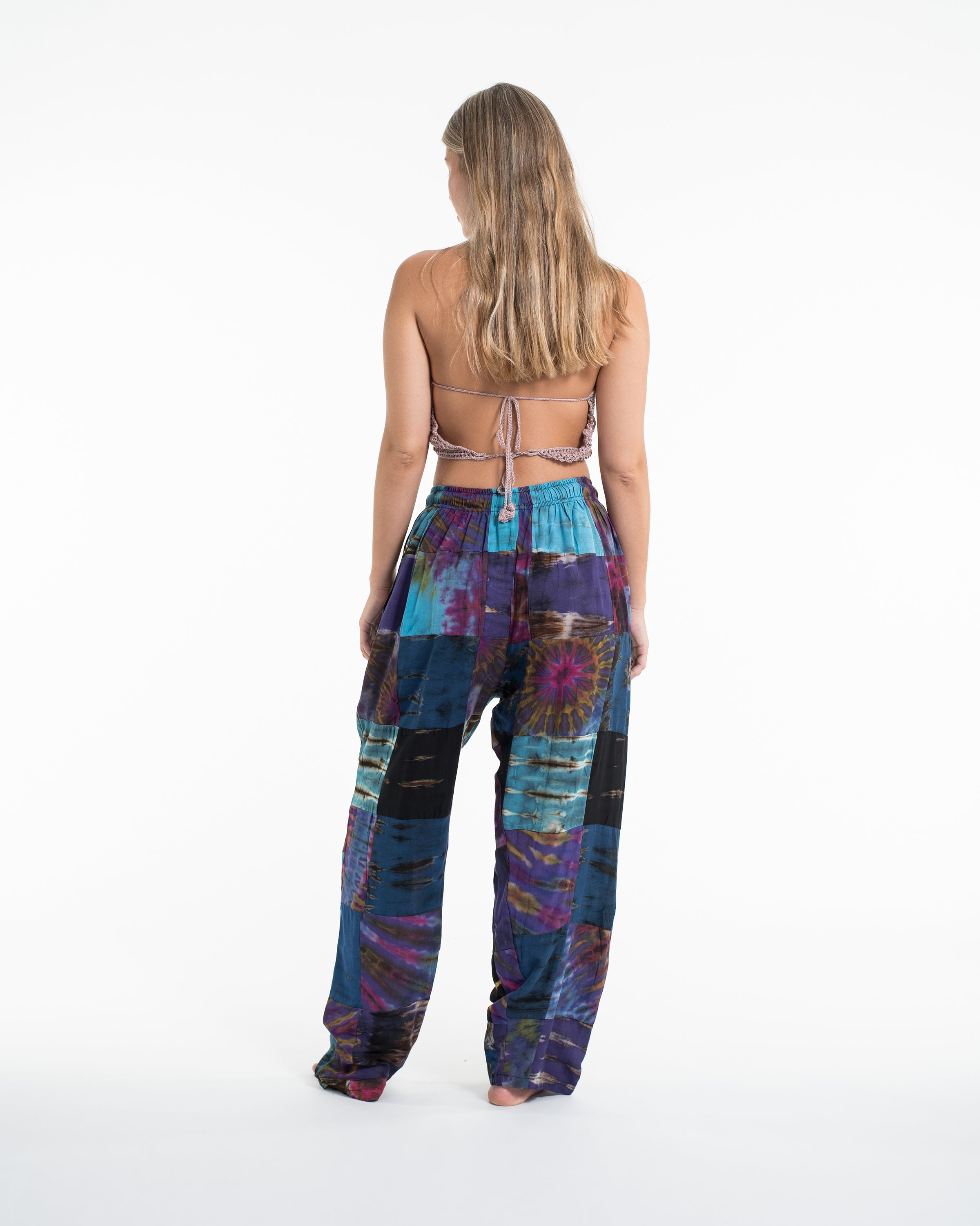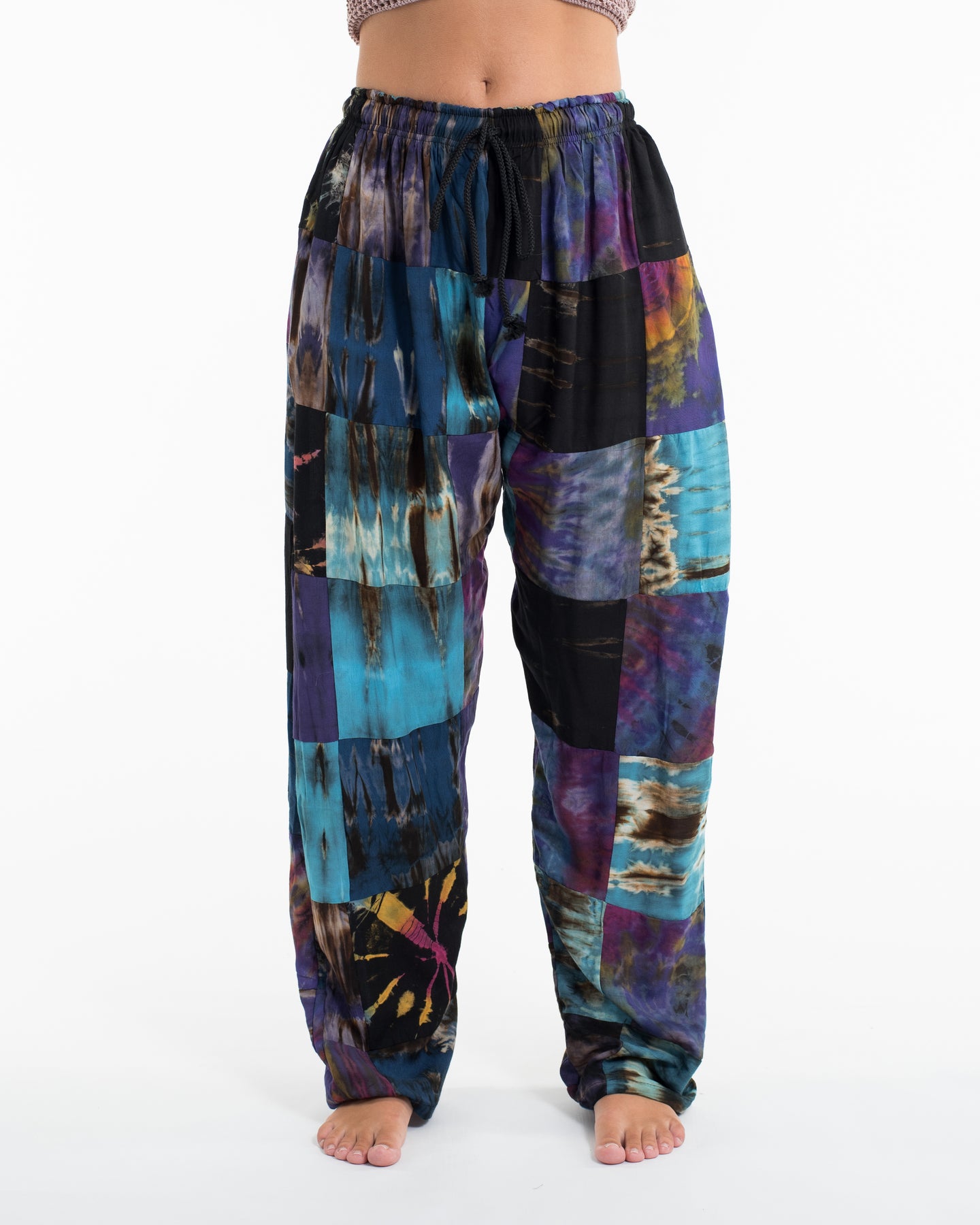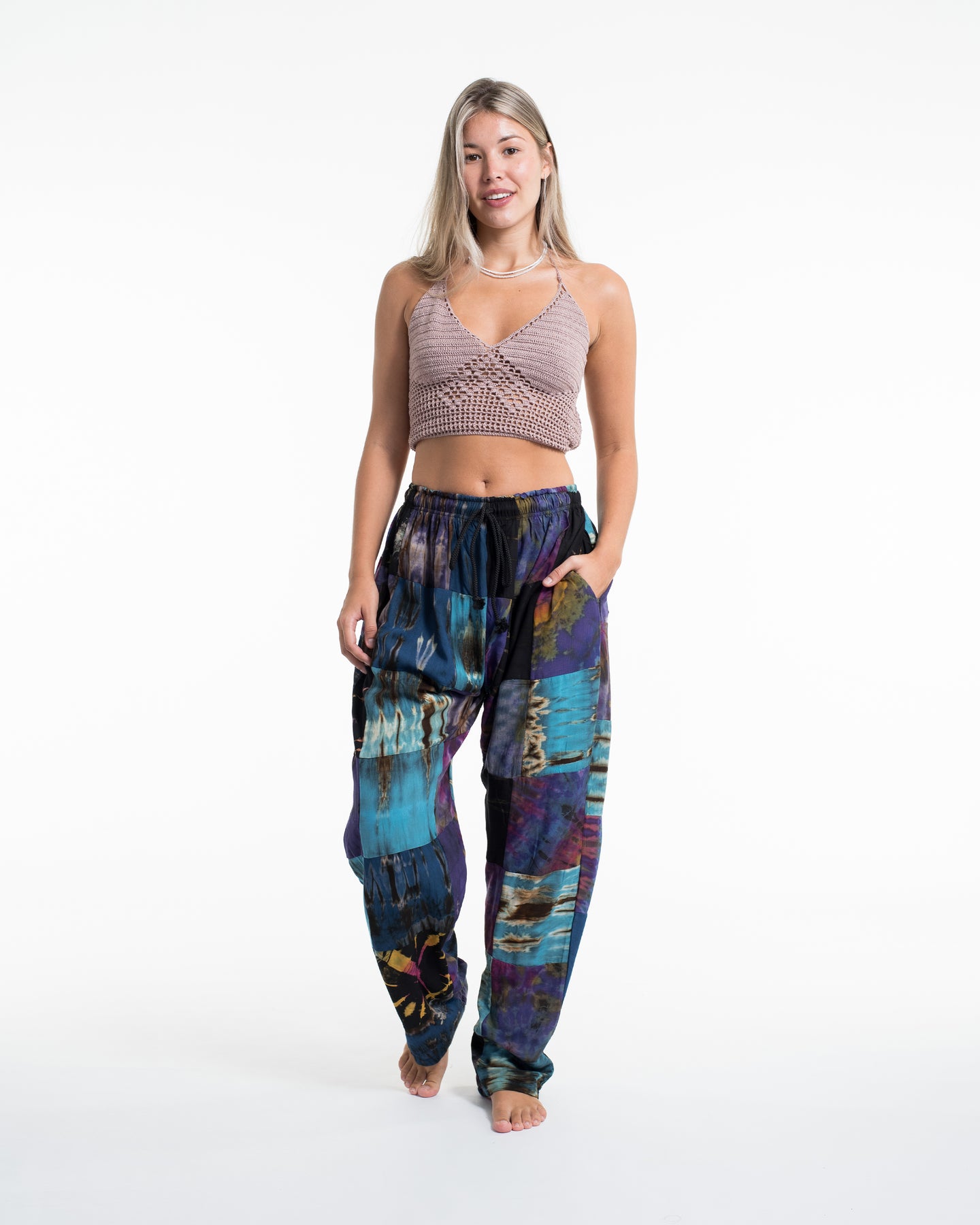 Bold. Lightweight. One-of-a-kind. These patchwork pants are handmade from soft rayon with a vibrant mix of tie-dyed squares—each pair totally unique. The relaxed fit and breathable fabric make them perfect for festivals, lounging, or creative everyday wear.