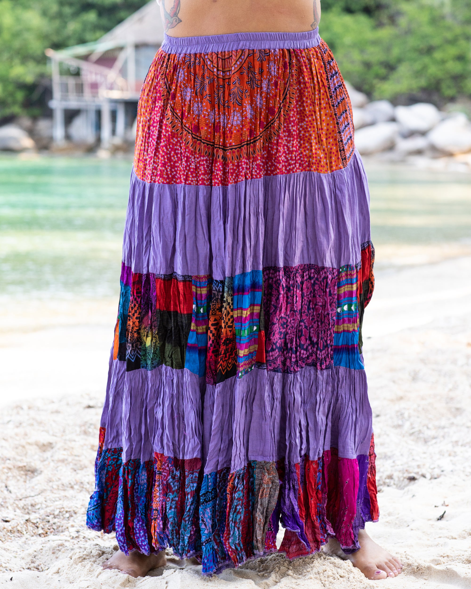 This one-of-a-kind patchwork skirt is sustainably made from upcycled cotton and rayon fabric scraps, featuring a beautiful and eclectic design with various shapes and sizes of fabric pieces sewn together. The lightweight and comfortable materials make it a perfect summer wear option.