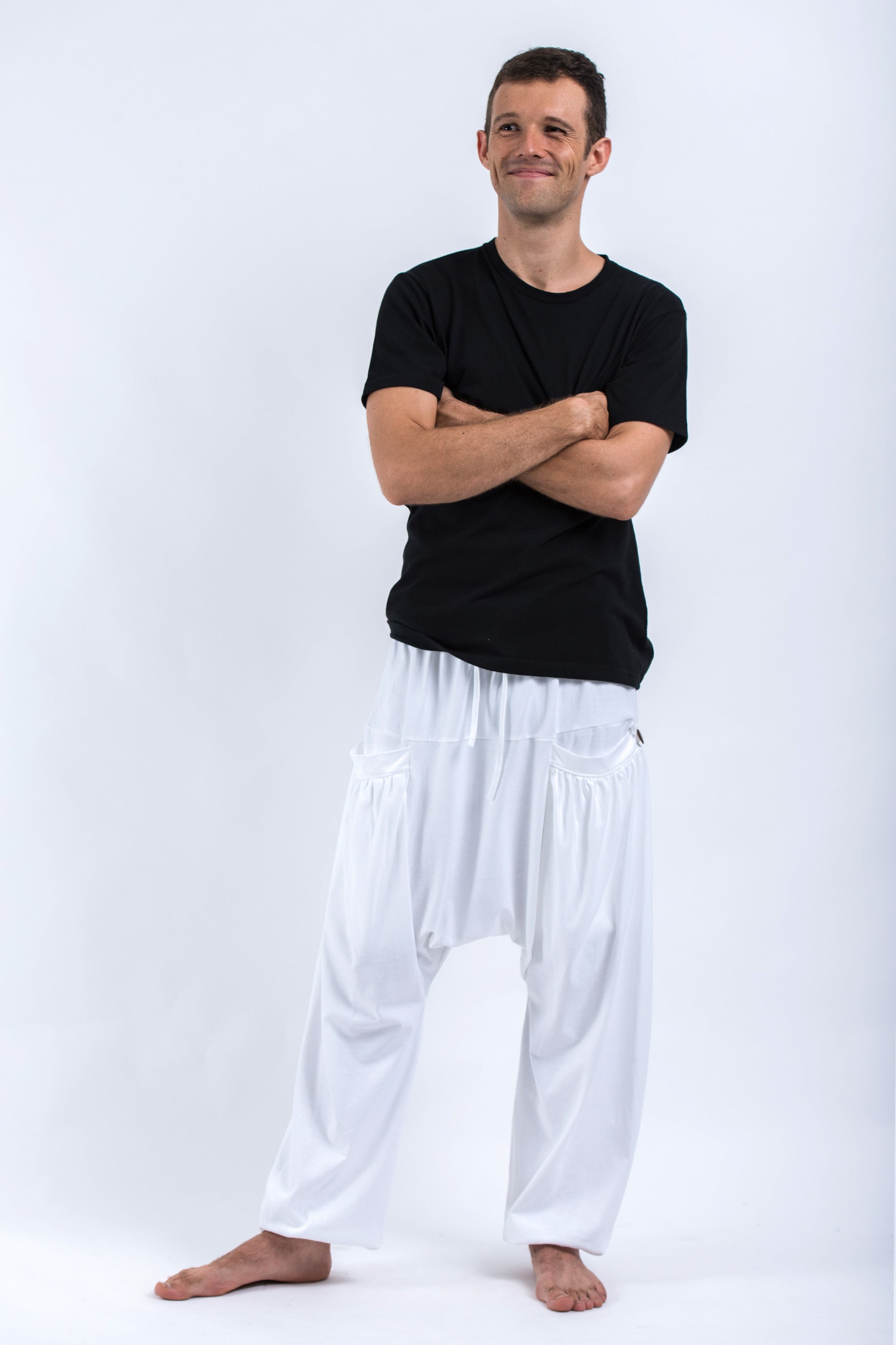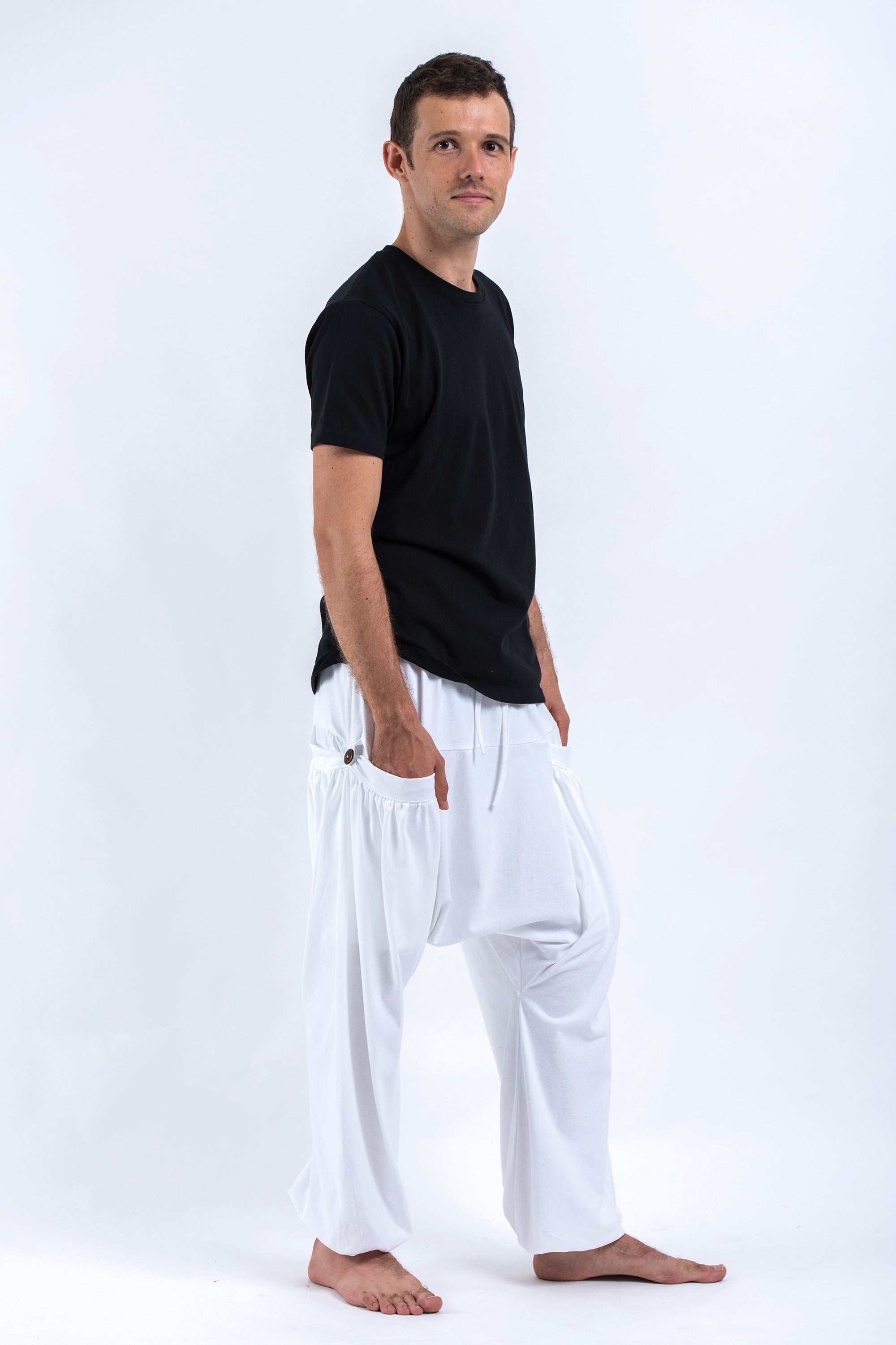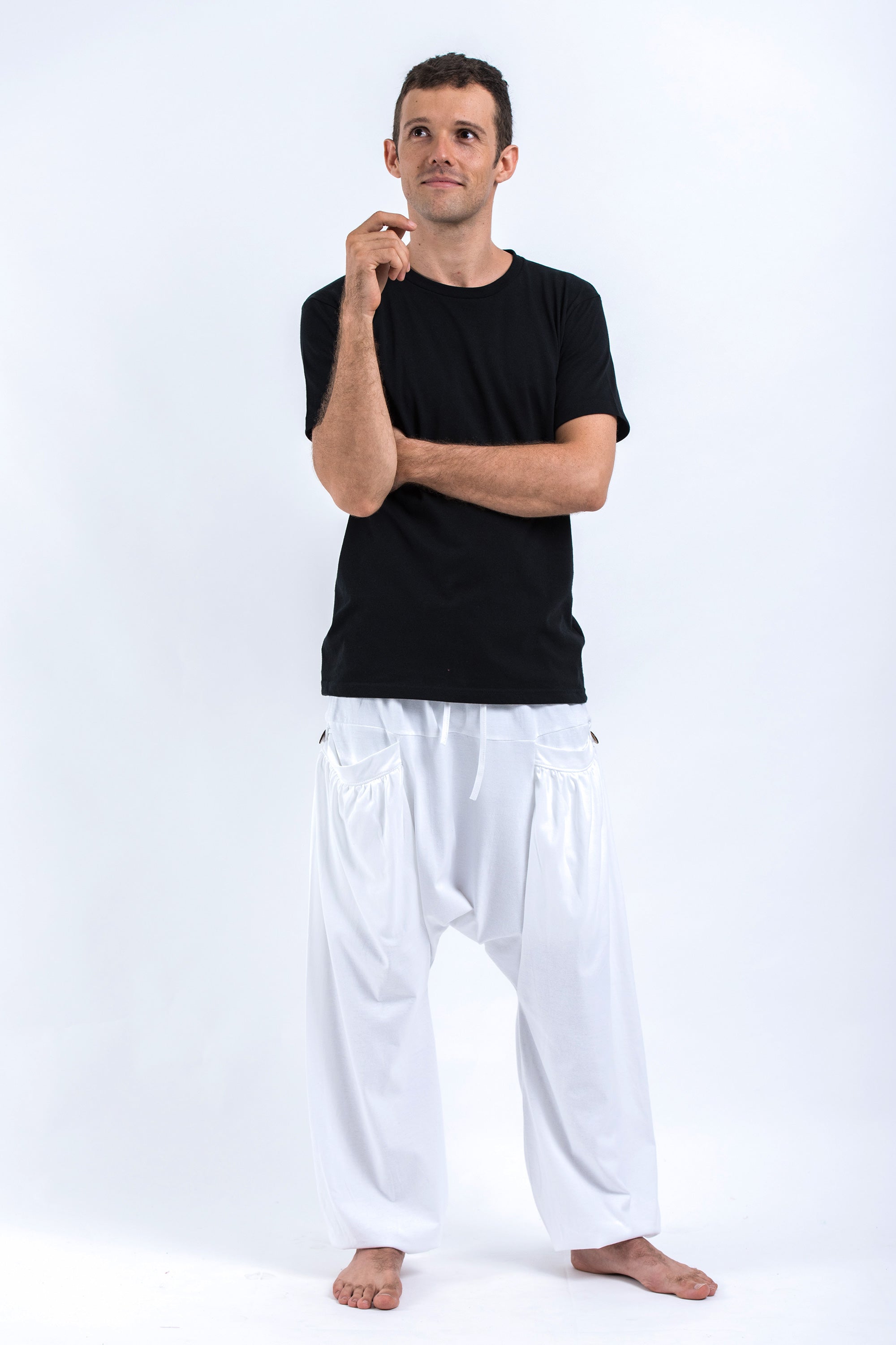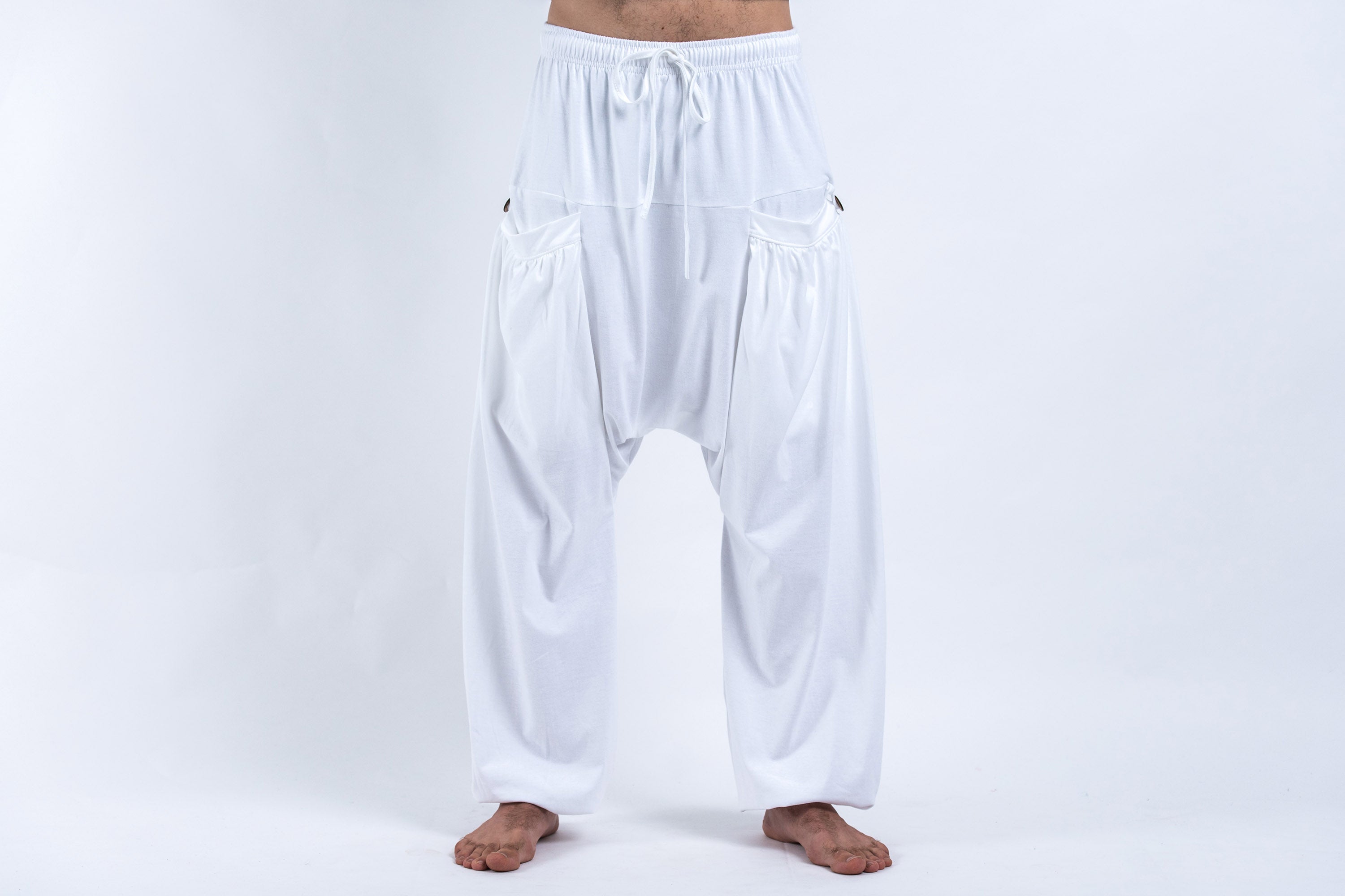 Loose-fit knitted cotton harem pants featuring elastic waist and ankle cuffs.