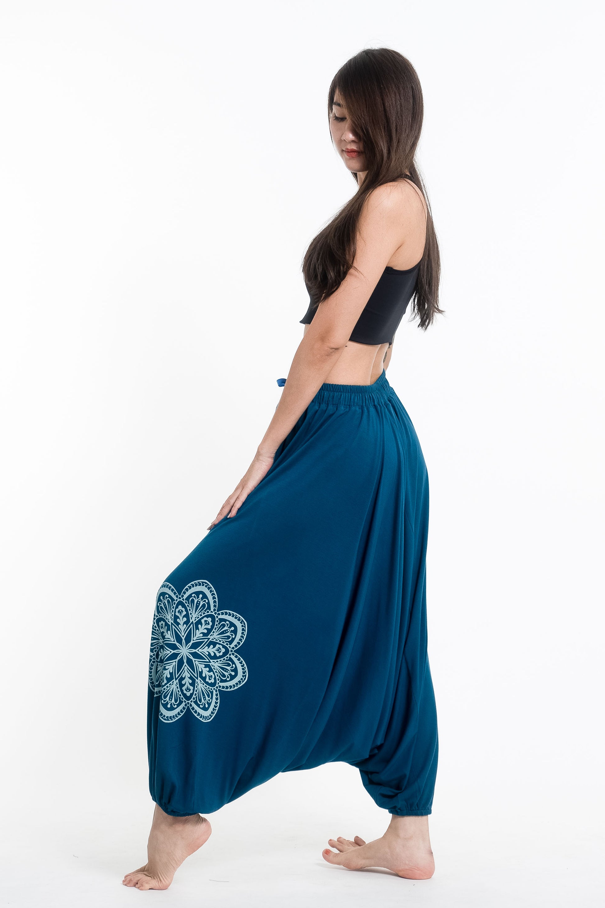 Mandala Print Drawstring Low Cut Harem Pants Cotton Spandex in Turquoise