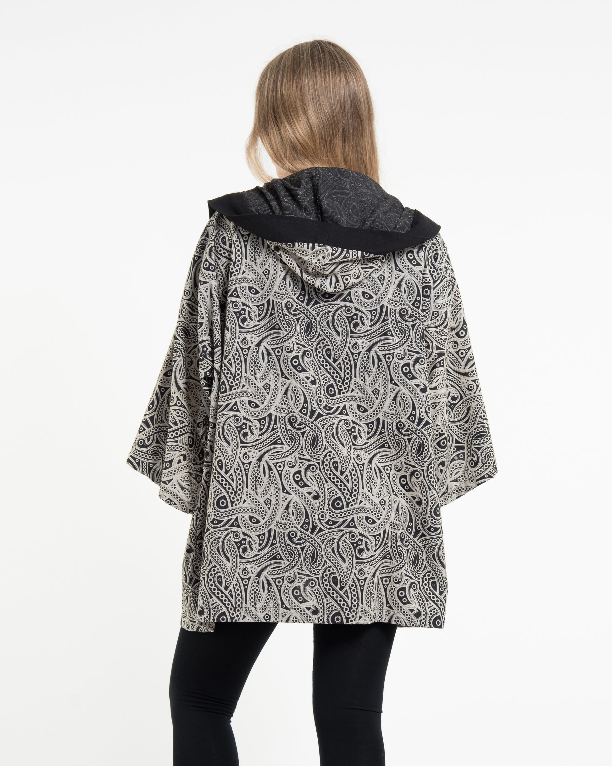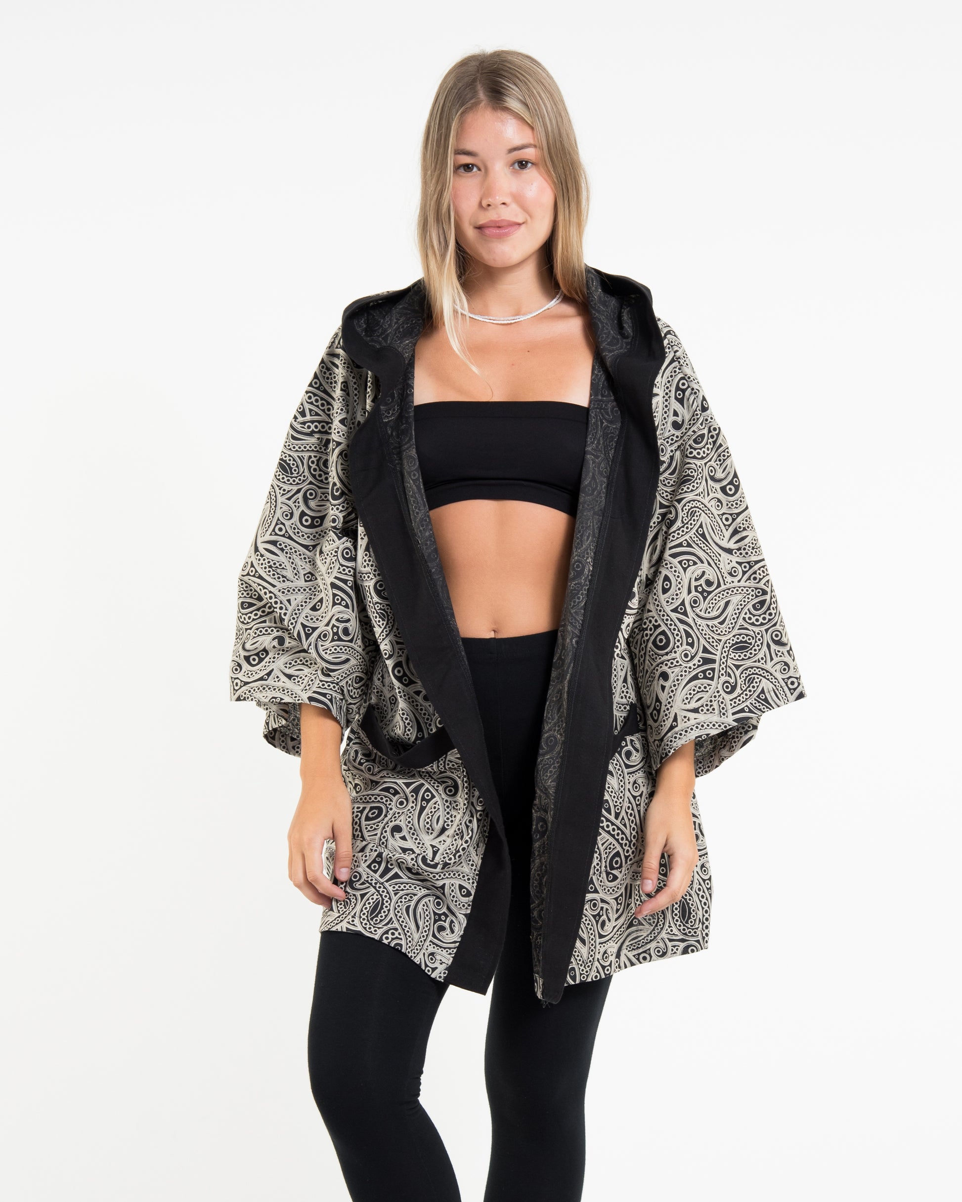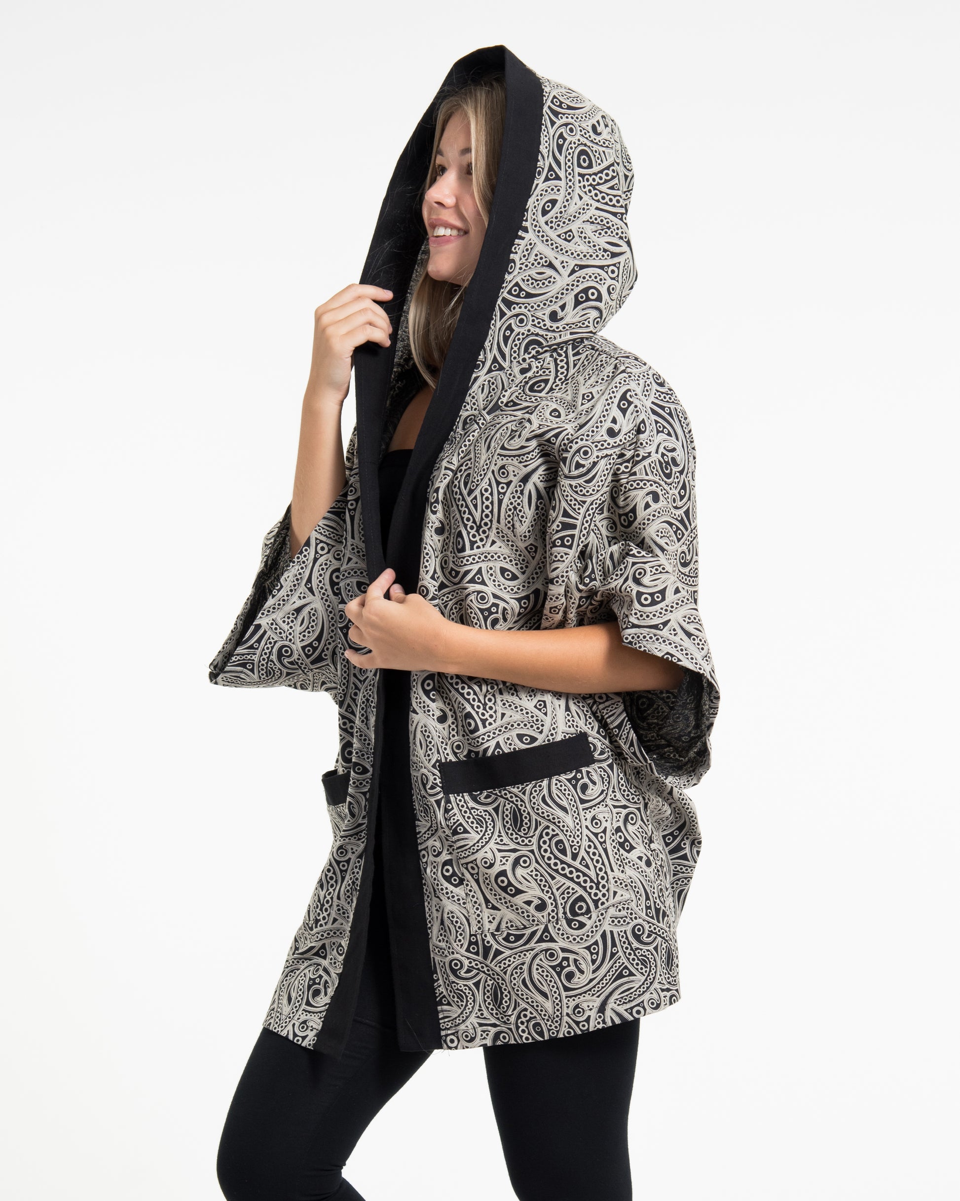 Paisley Print Cotton Hoodie Kimono Cardigan in Black
