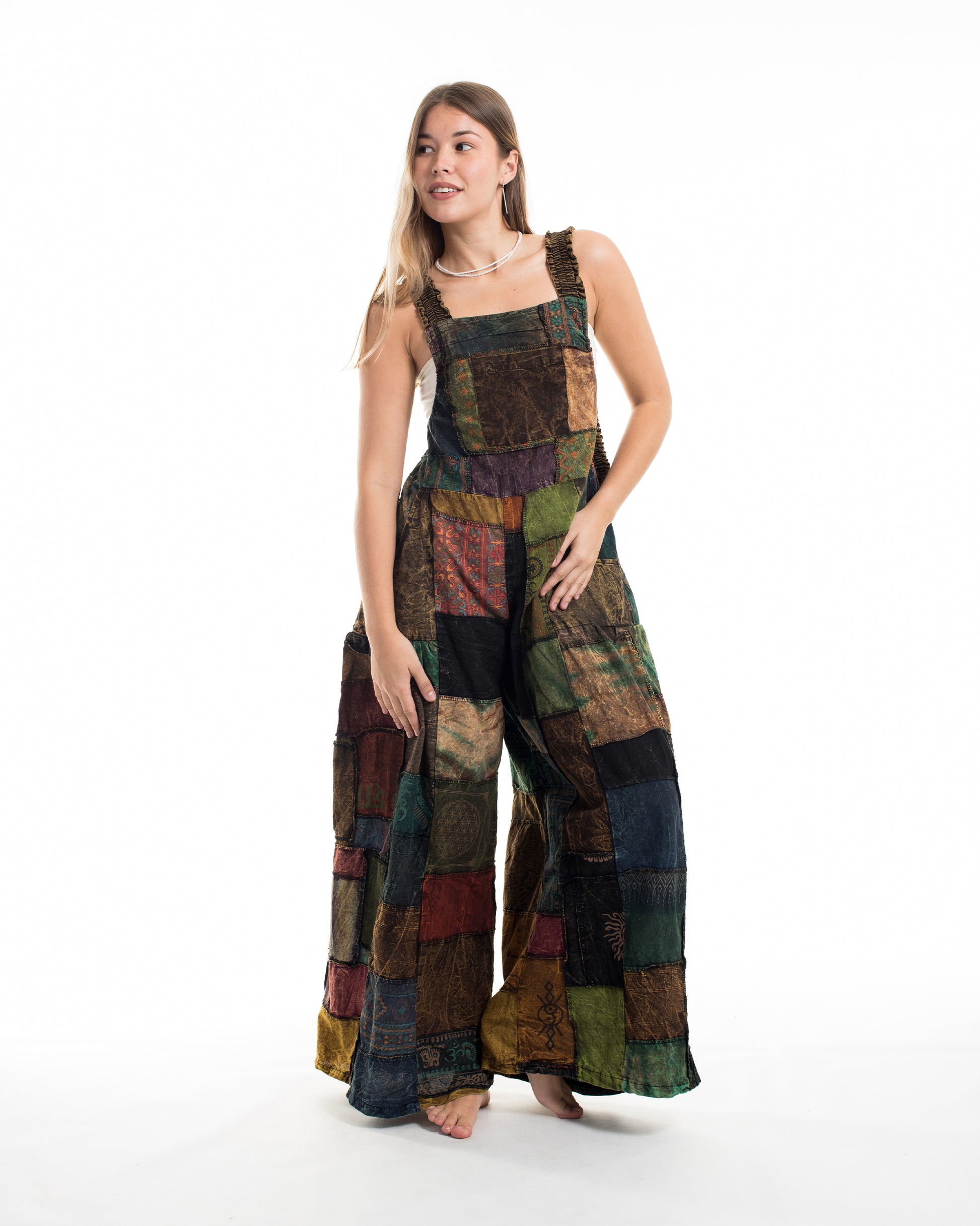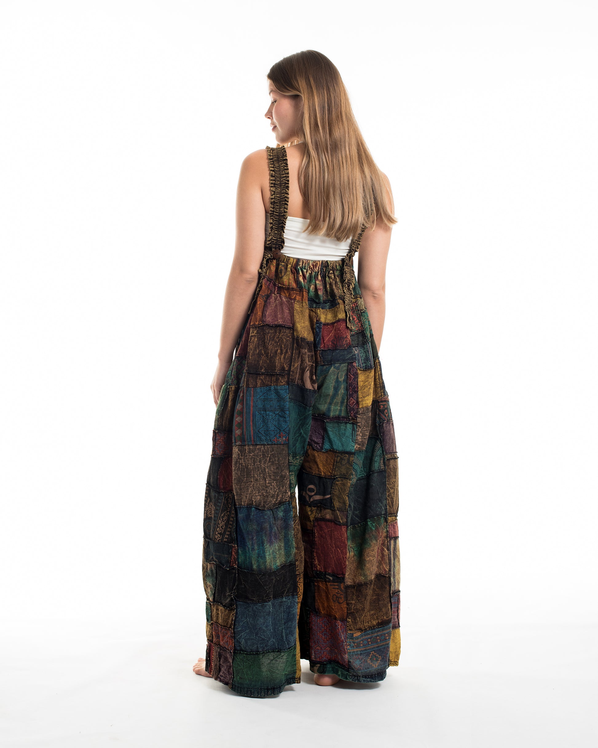 Perfectly handcrafted Indian patchwork stone washed cotton overall with adjustable length with a button at the back. There is 3 holes to adjust the straps with coconut buttons closure straps. One pocket in the front and two pockets on the side. Maximum comfort with roomy legs and with elastic at the back.