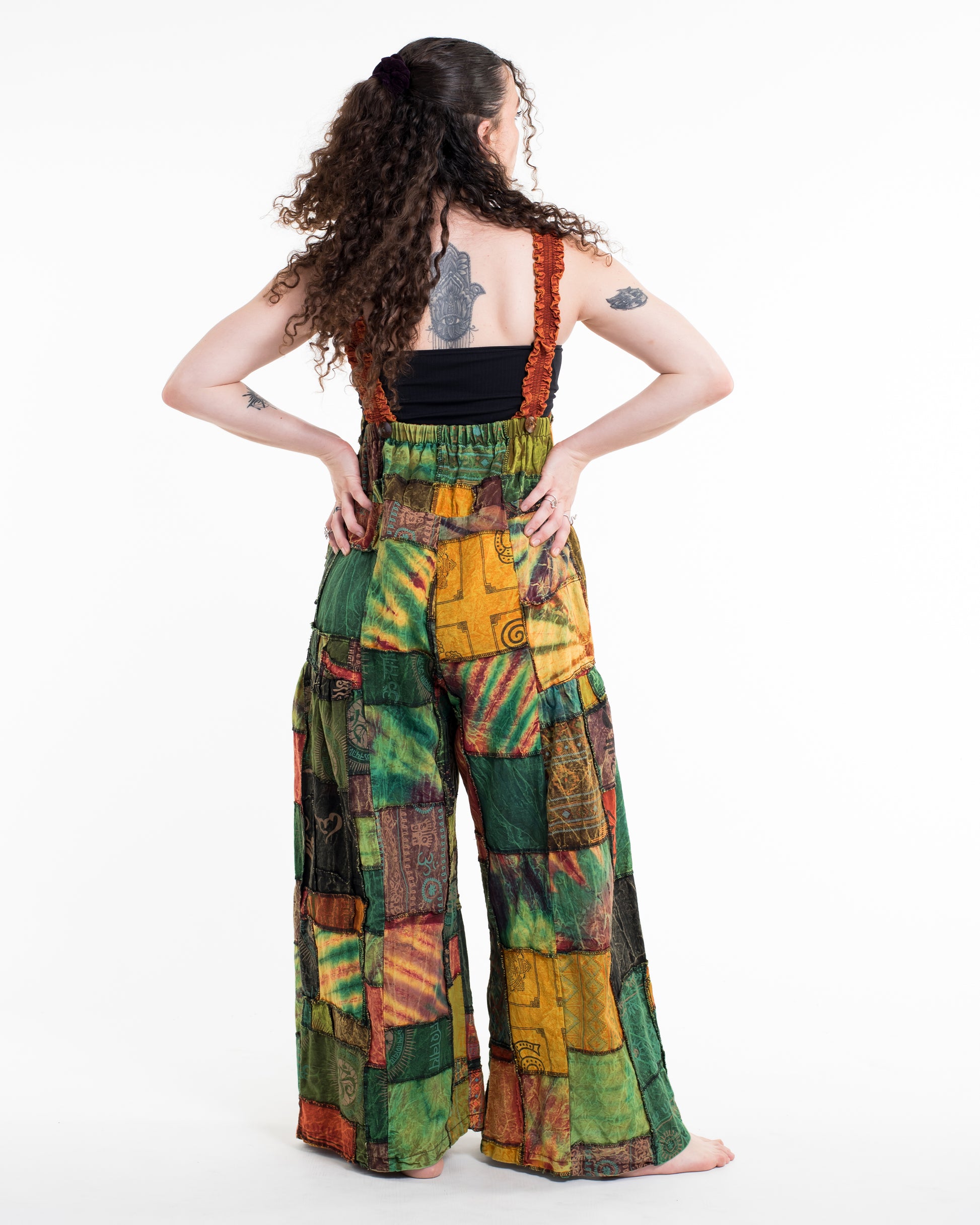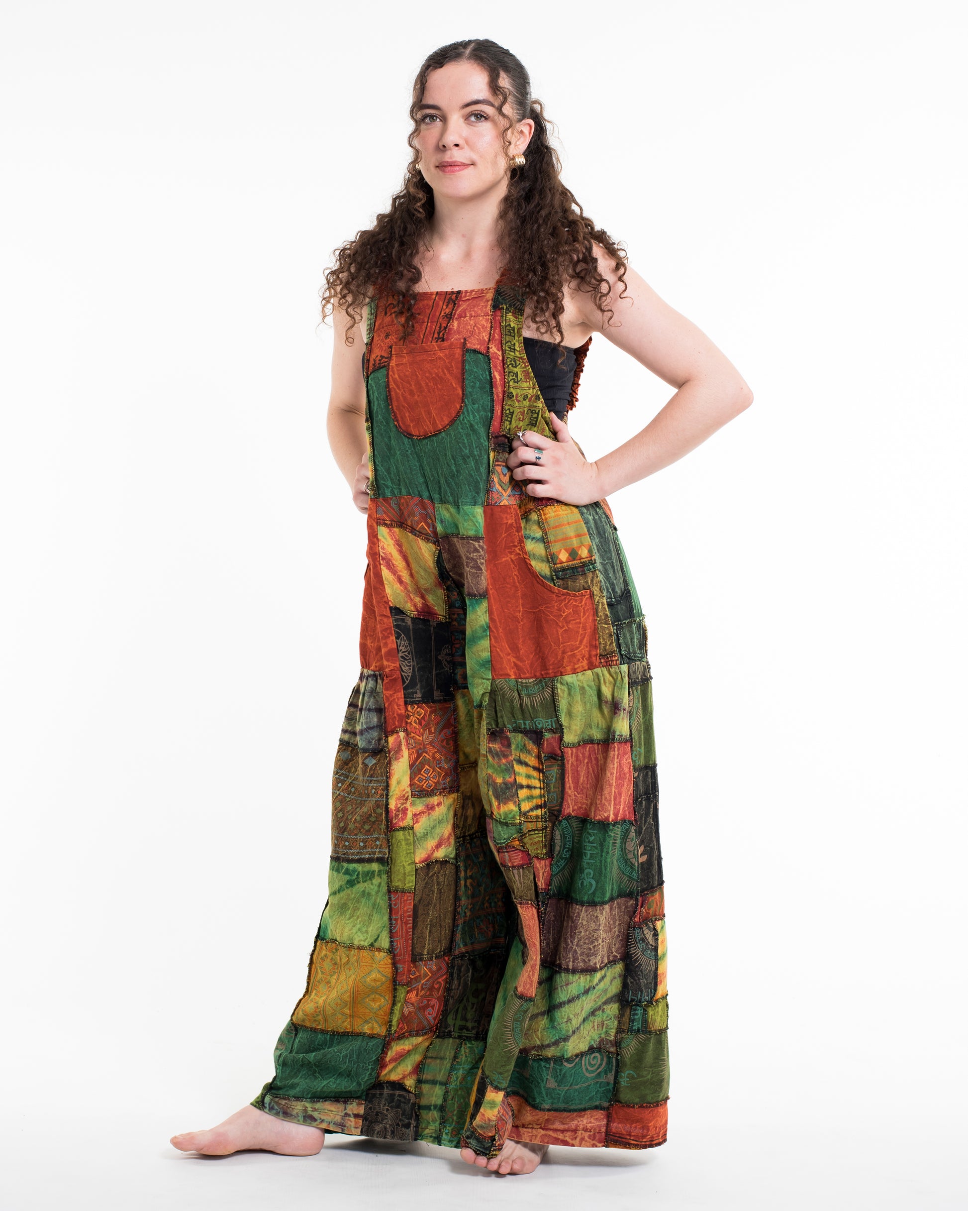 Perfectly handcrafted Indian patchwork stone washed cotton overall with adjustable length with a button at the back. There is 3 holes to adjust the straps with coconut buttons closure straps. One pocket in the front and two pockets on the side. Maximum comfort with roomy legs and with elastic at the back.