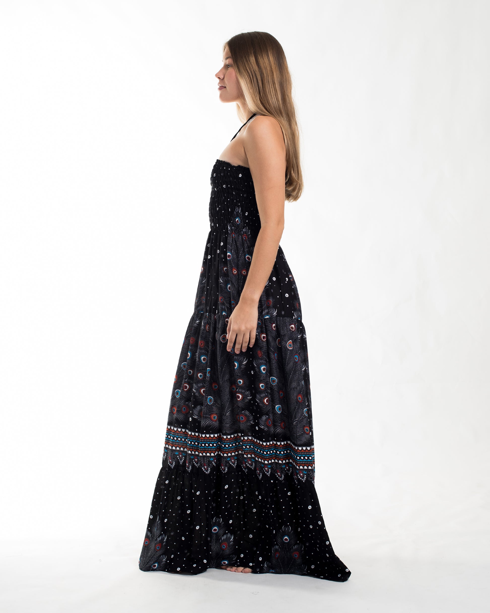 Peacock Smocked Maxi Dress in Black