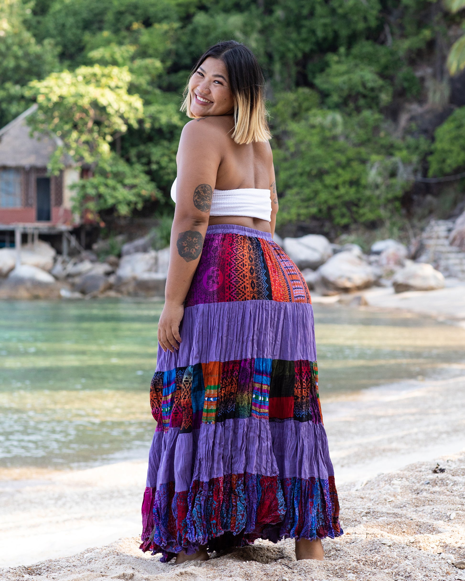 This one-of-a-kind patchwork skirt is sustainably made from upcycled cotton and rayon fabric scraps, featuring a beautiful and eclectic design with various shapes and sizes of fabric pieces sewn together. The lightweight and comfortable materials make it a perfect summer wear option.