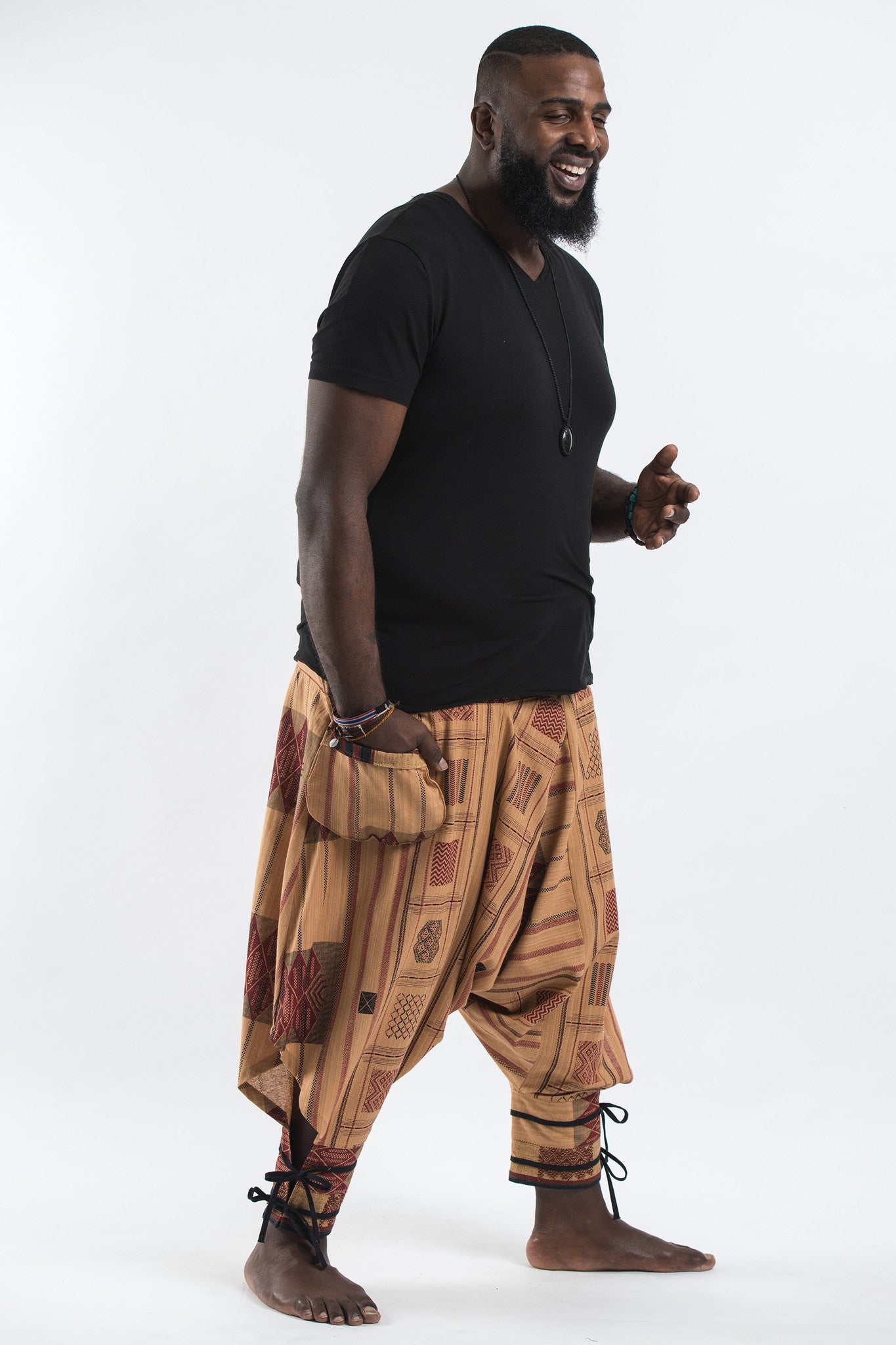 Plus Size Thai Hill Tribe Fabric Men Harem Pants with Ankle Straps in Beige