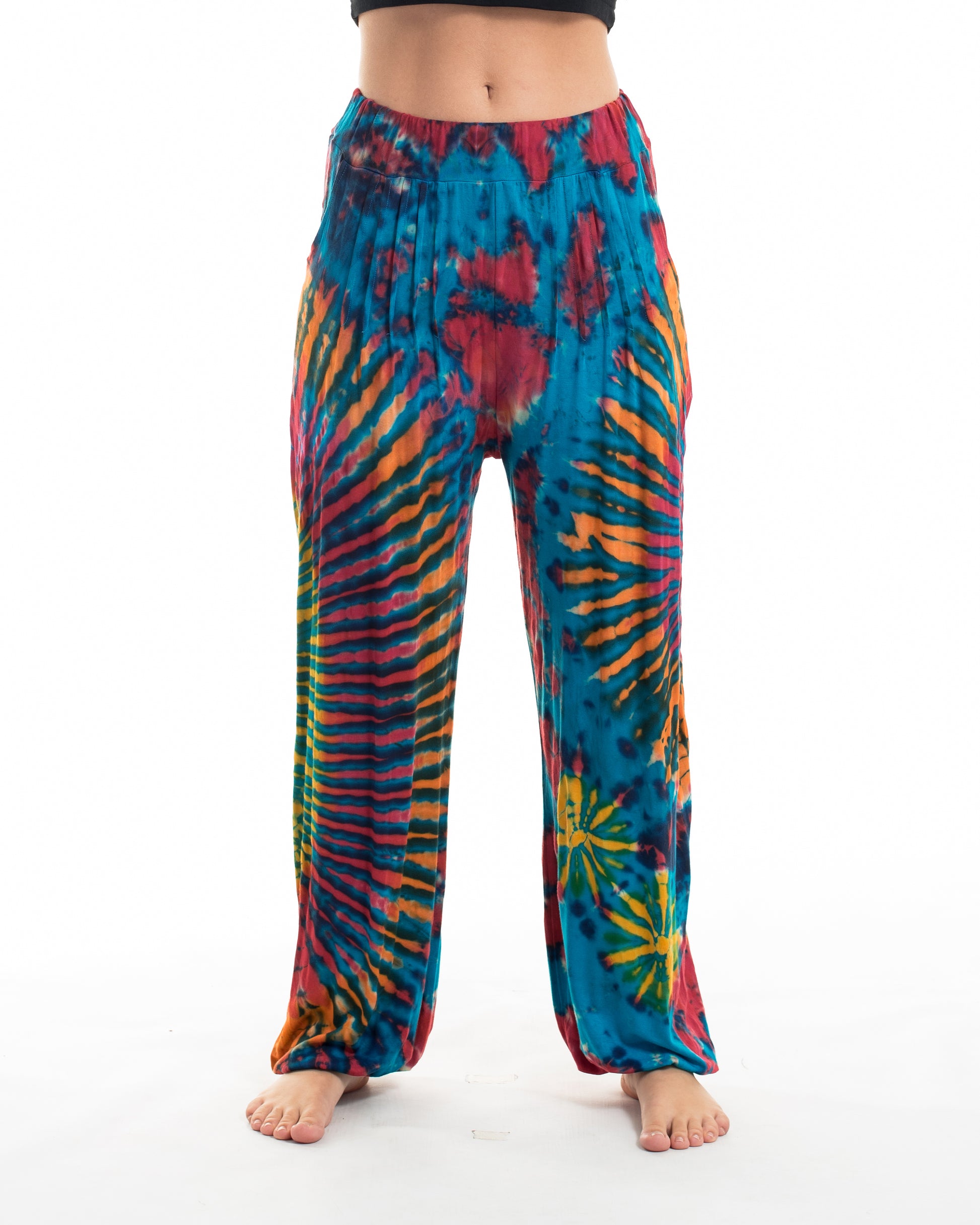 Our tie-dye pants are handmade in small batches, so color and pattern placement may vary slightly from piece to piece. Tie-dye color may run during the first few washes, so please wash separately.