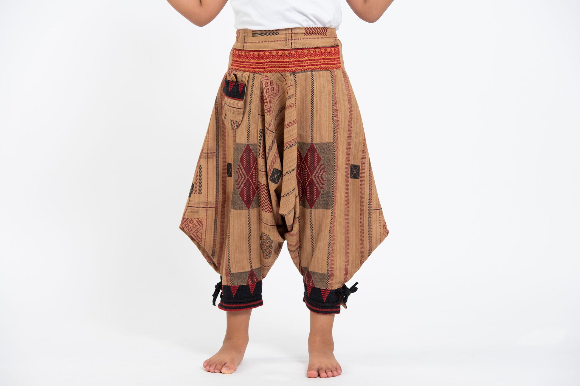 Thai Hill Tribe Fabric Kids Harem Pants with Ankle Straps in Beige