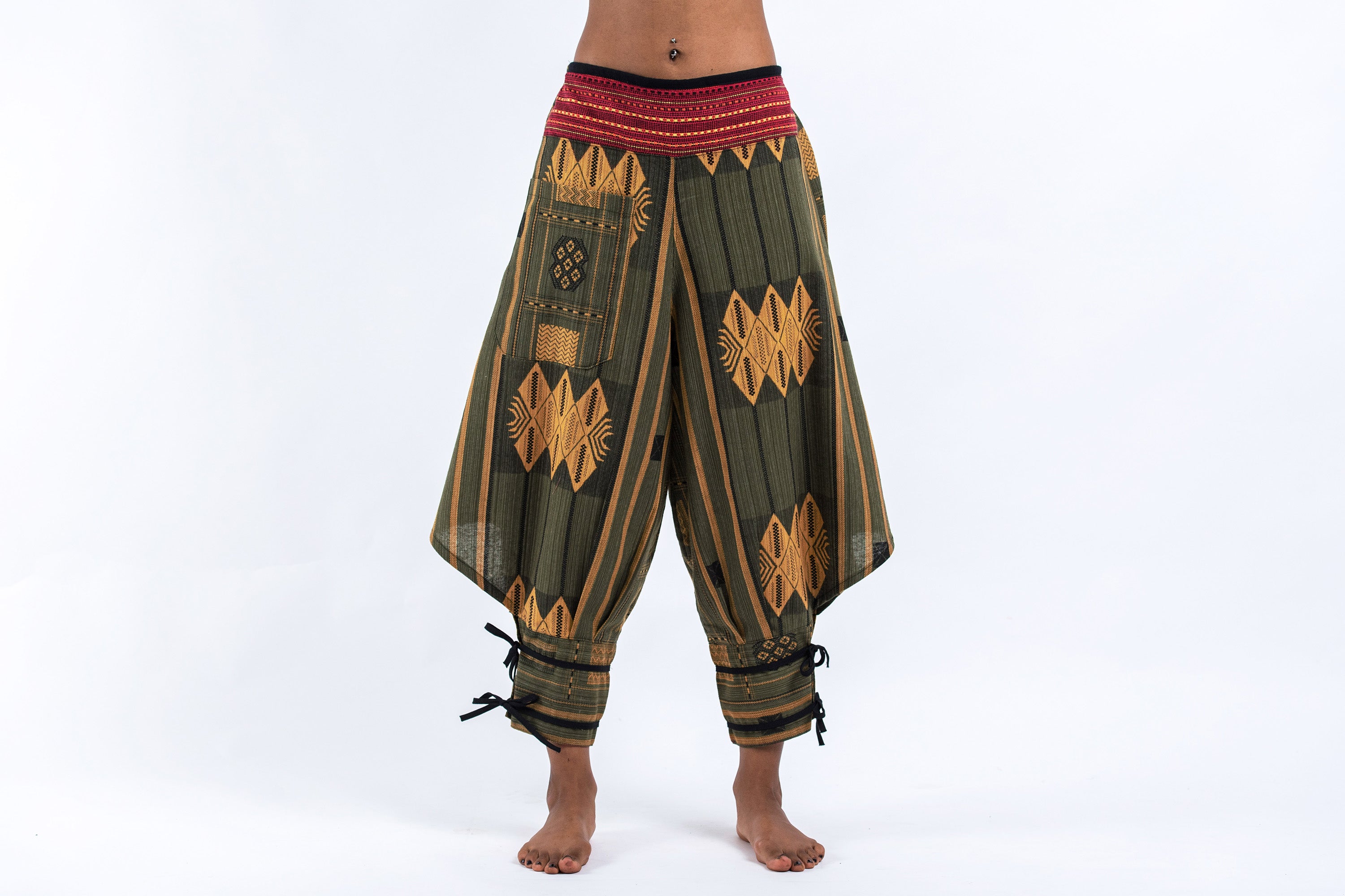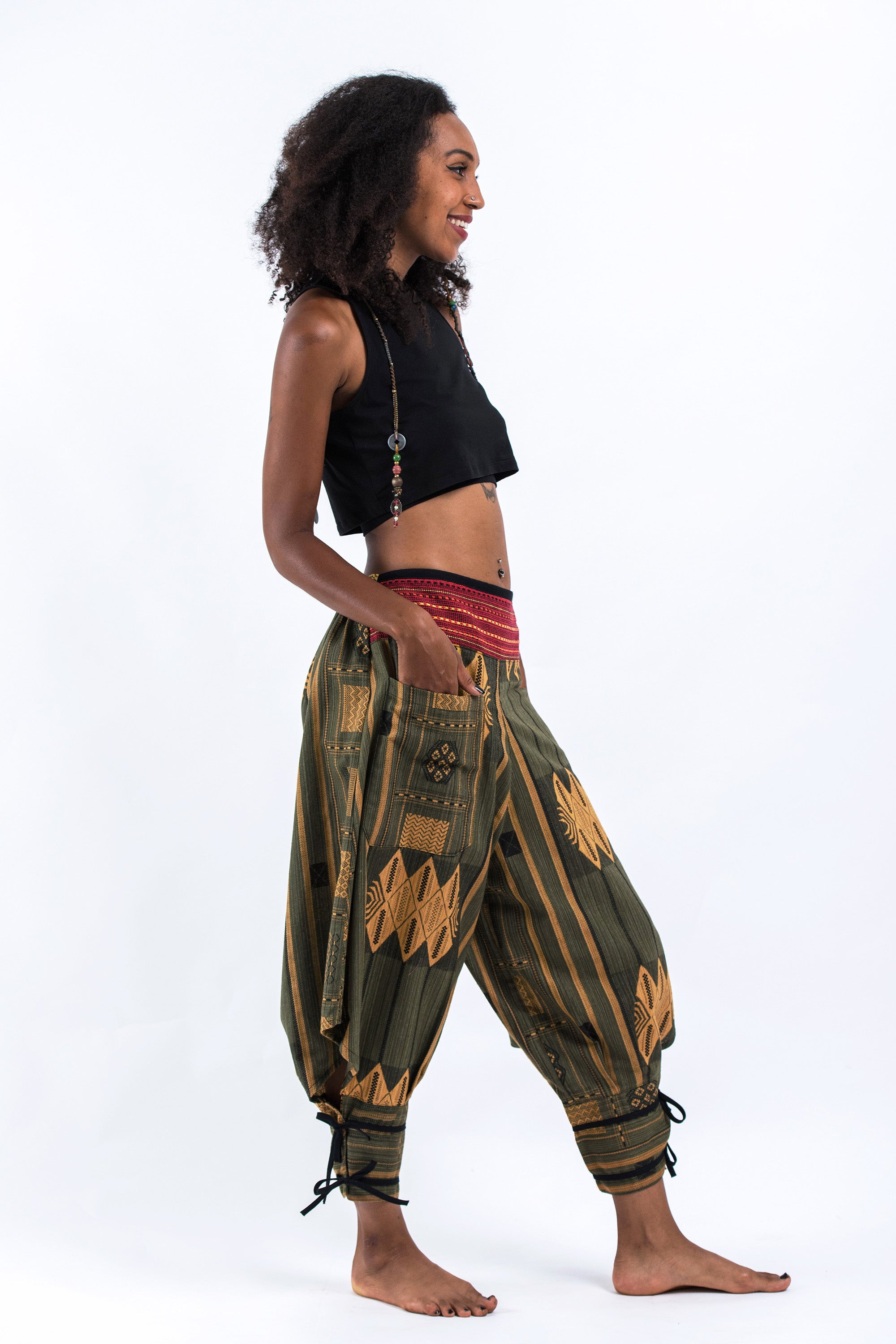 Thai Hill Tribe Fabric Women's Harem Pants with Ankle Straps in Olive