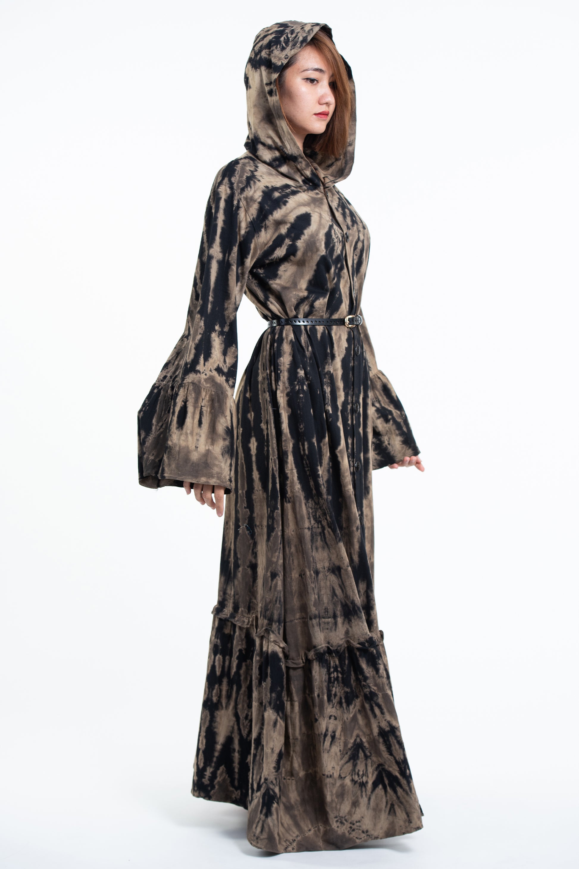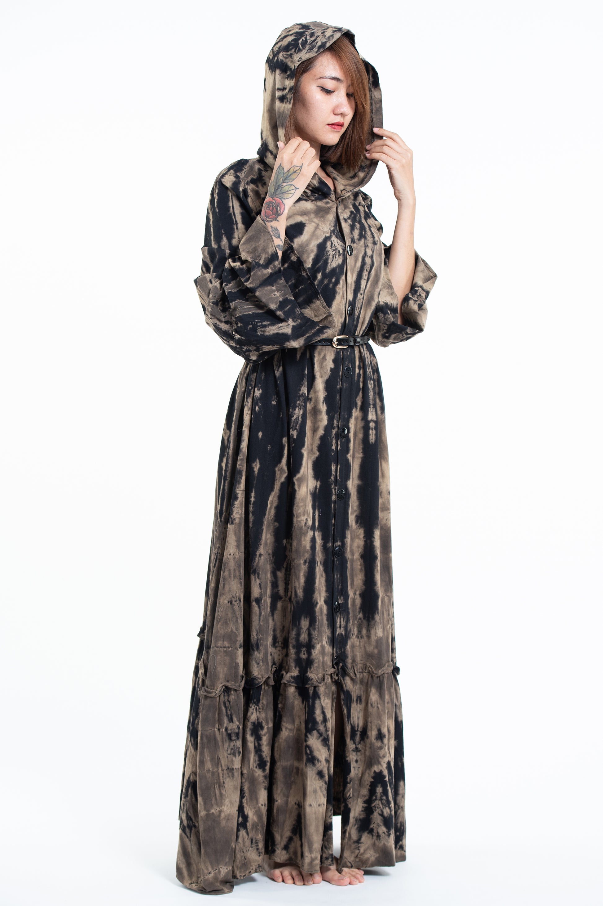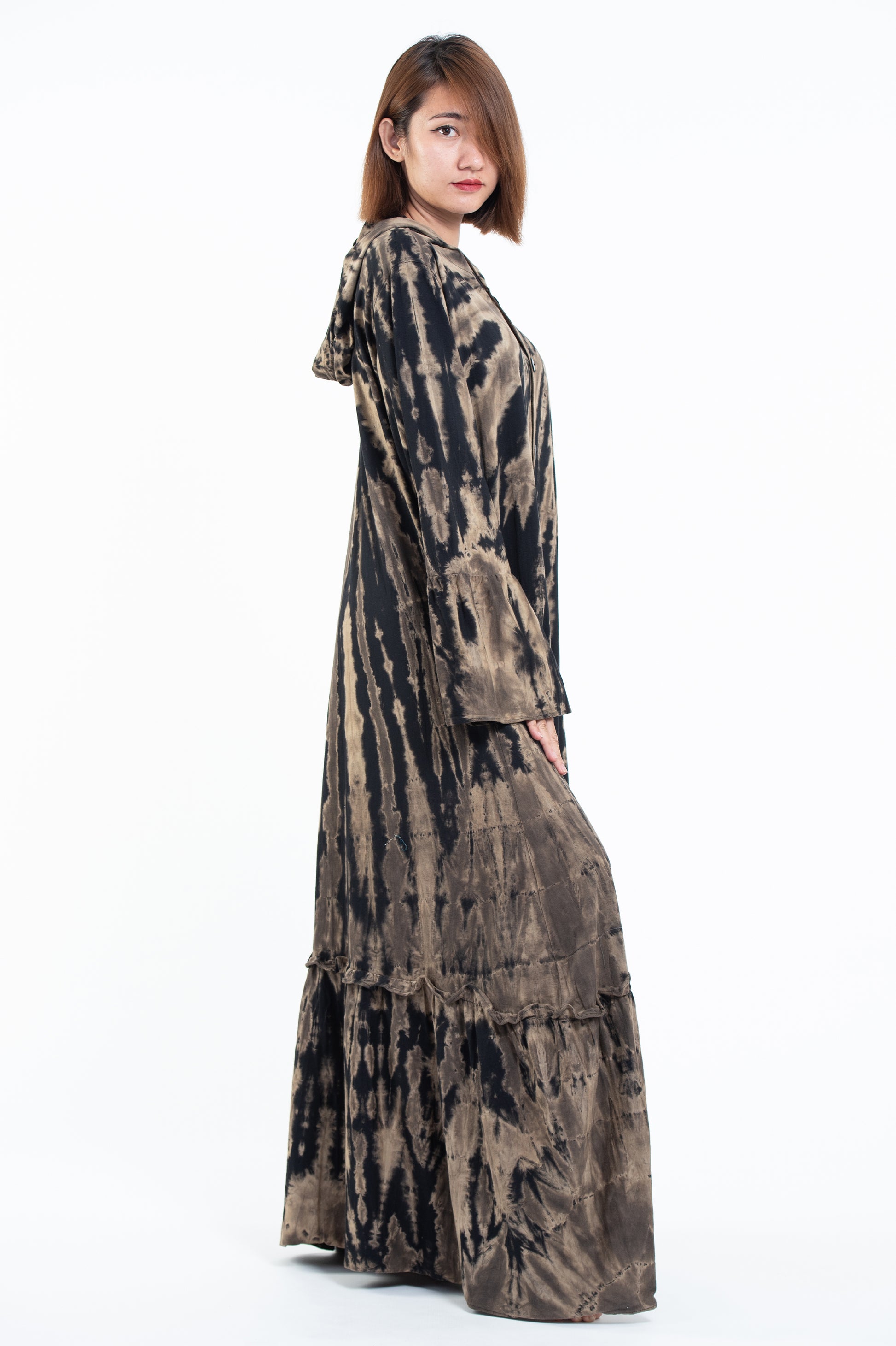 Tie Dye Hoodie Long Sleeve Maxi Dress in Black Tan