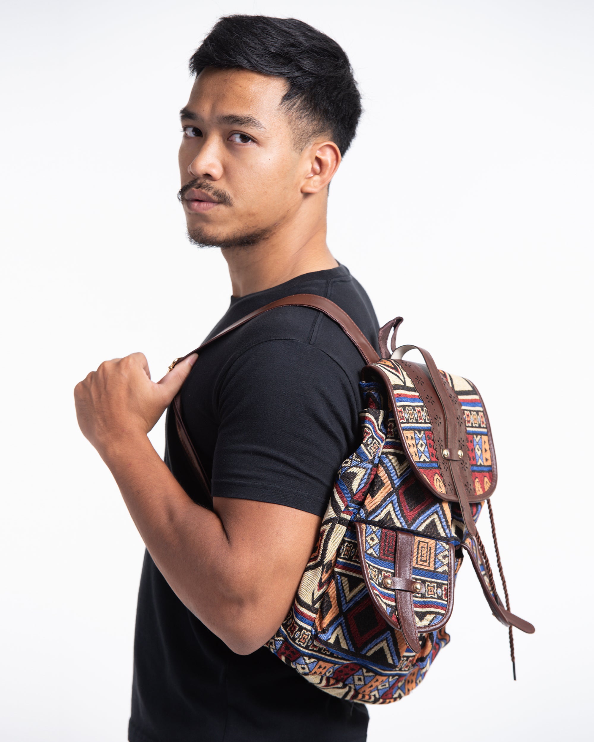 Cool light-weight tribal pattern fabric backpack with faux leather trims, and adjustable straps