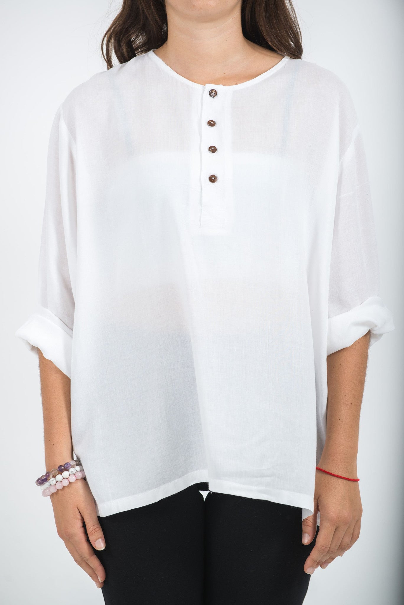 Womens Yoga Shirts No Collar with Coconut Buttons in White